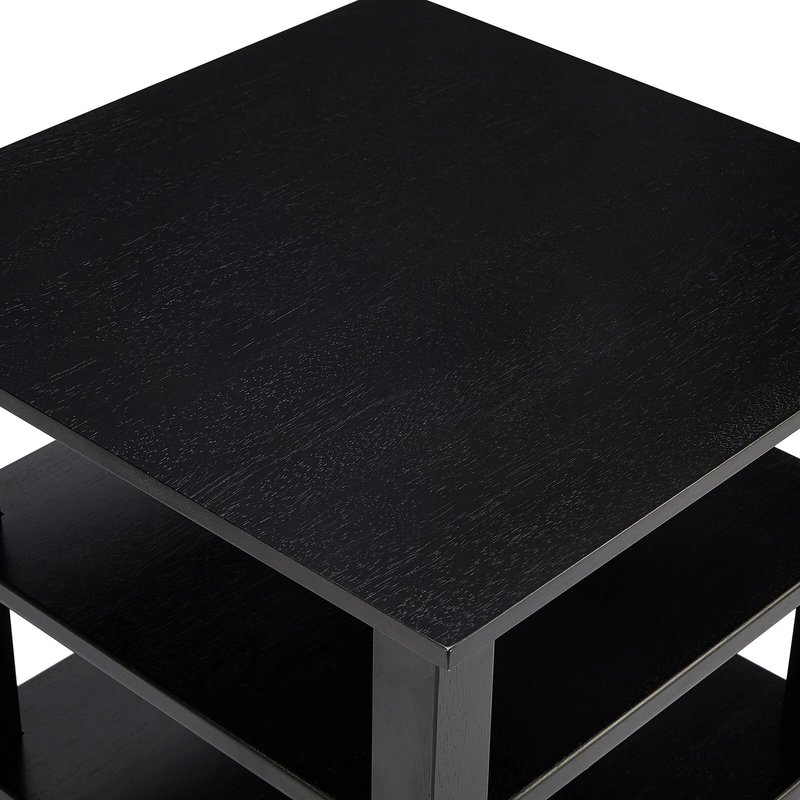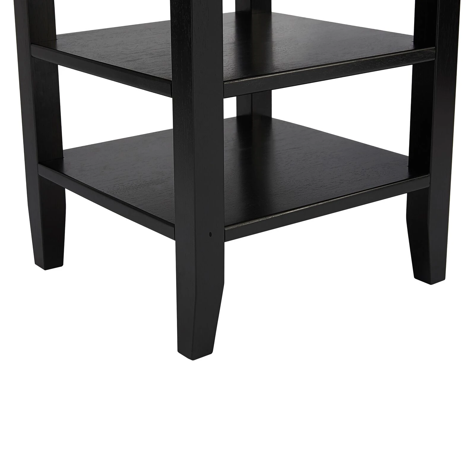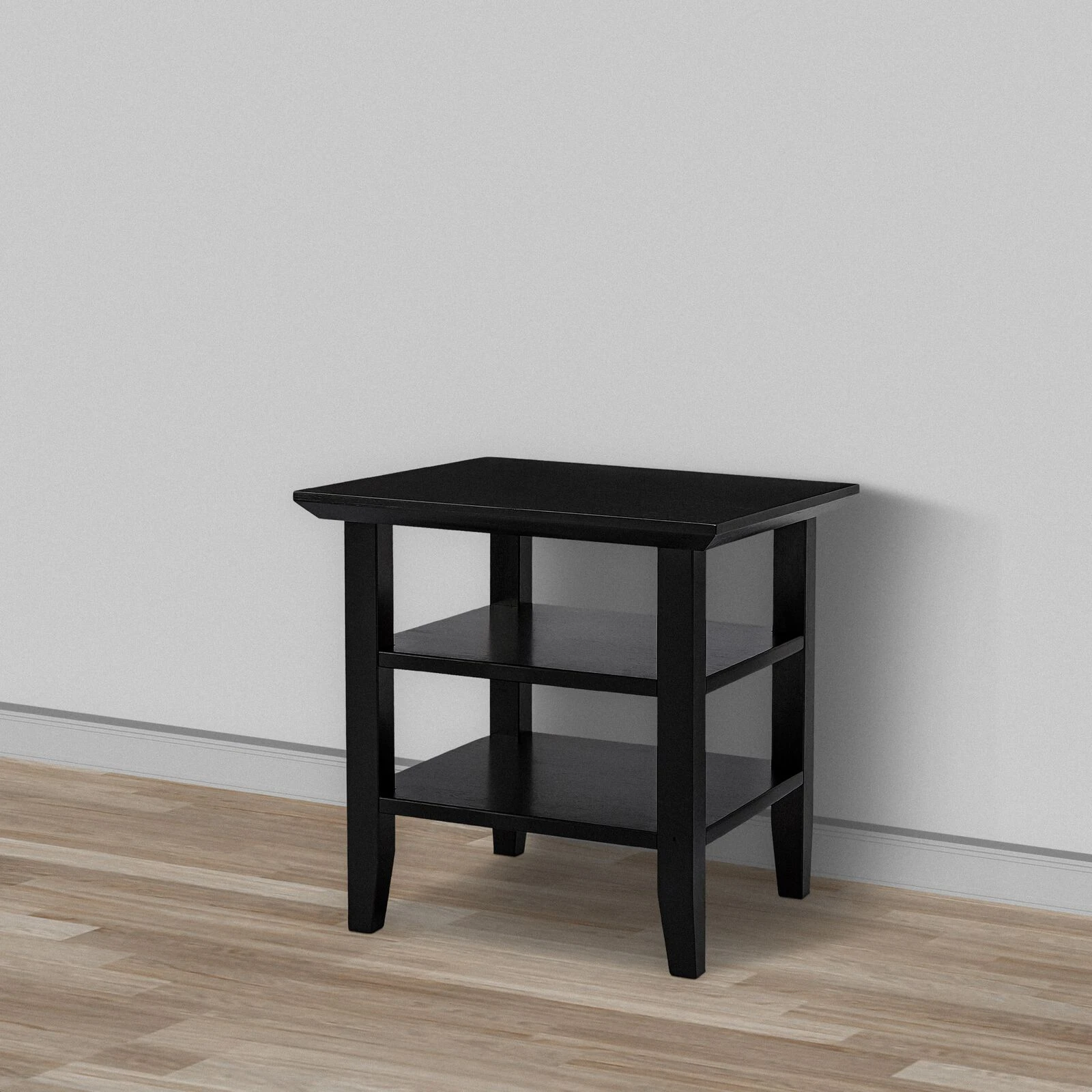 This exquisite wood side end table is guaranteed to add a handcrafted flair to your interior, featuring a wide tabletop and two open bottom shelves, it offers plenty of space to display decorations and hold living room essentials such as remotes and a lamp. With a durable rubberwood construction for lasting usability, the blazing black toned finish exudes an essence of riveting charm from it. It is supported sturdily on chamfered legs for stability and it makes for a splendid focal point in any living space.