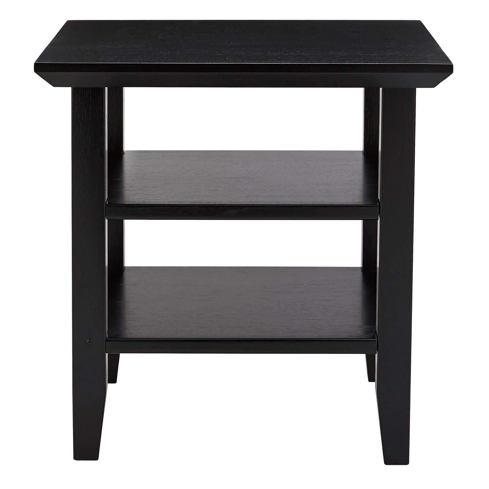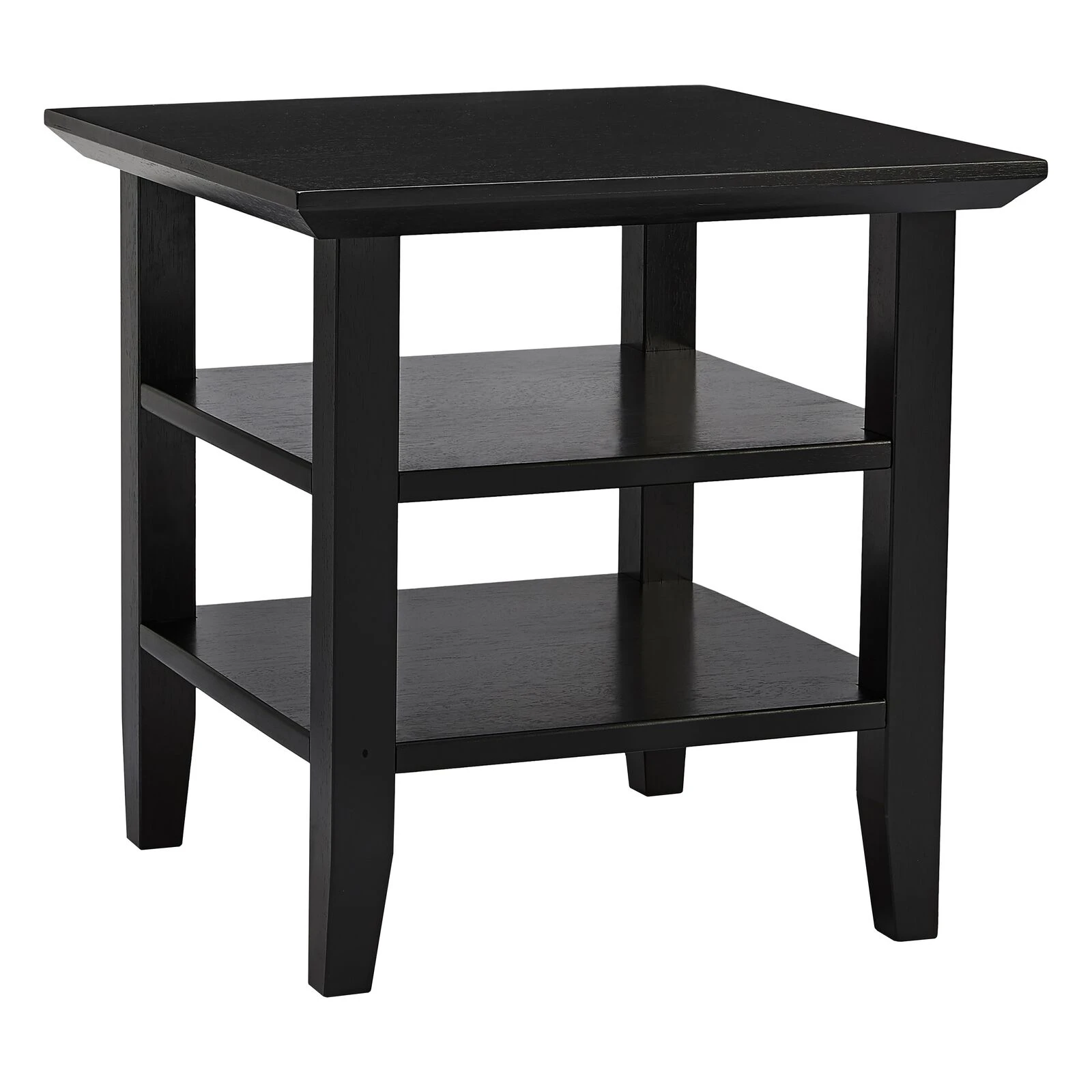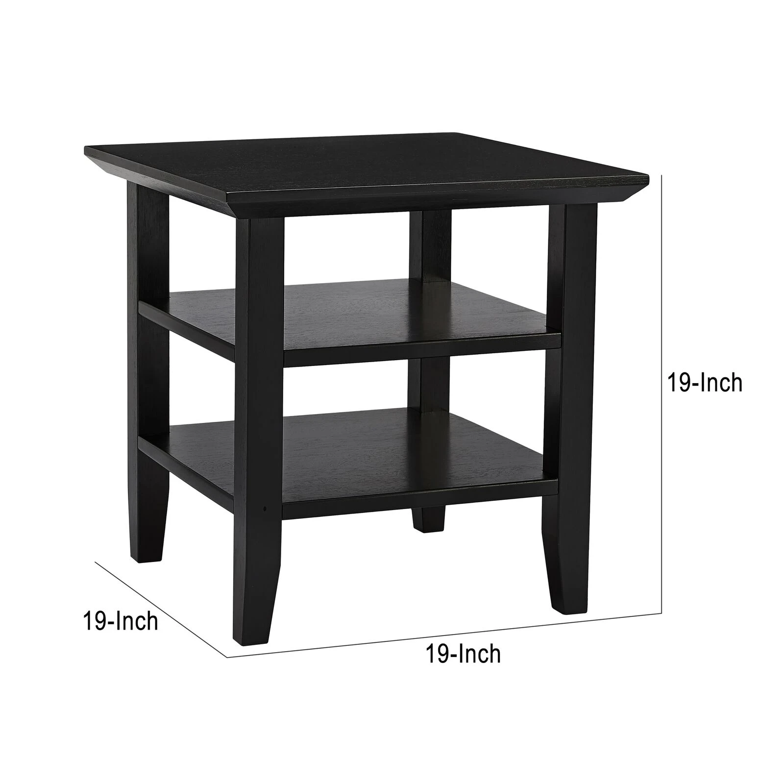 19 Inch Handcrafted Rubberwood Square Side End Table, 2 Shelves, Chamfered Legs, Black-Benzara