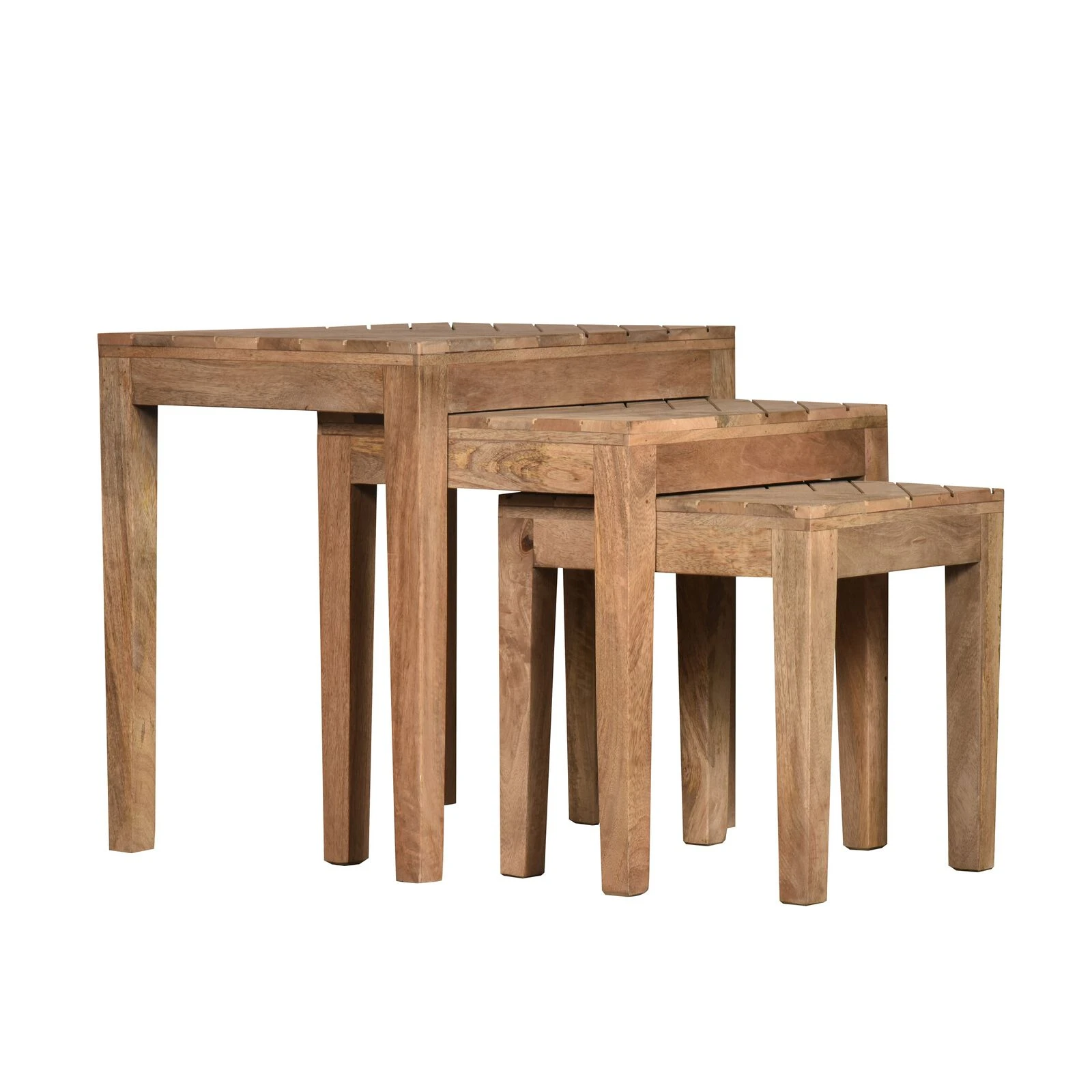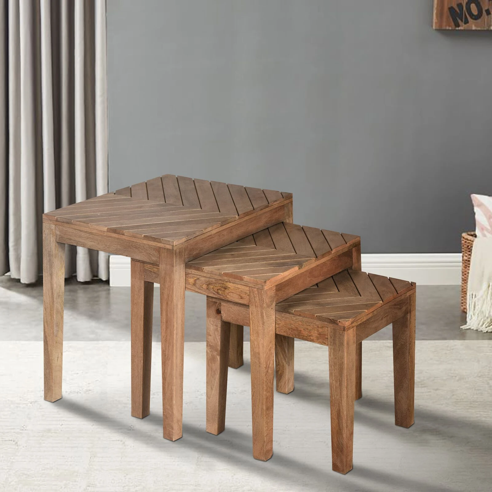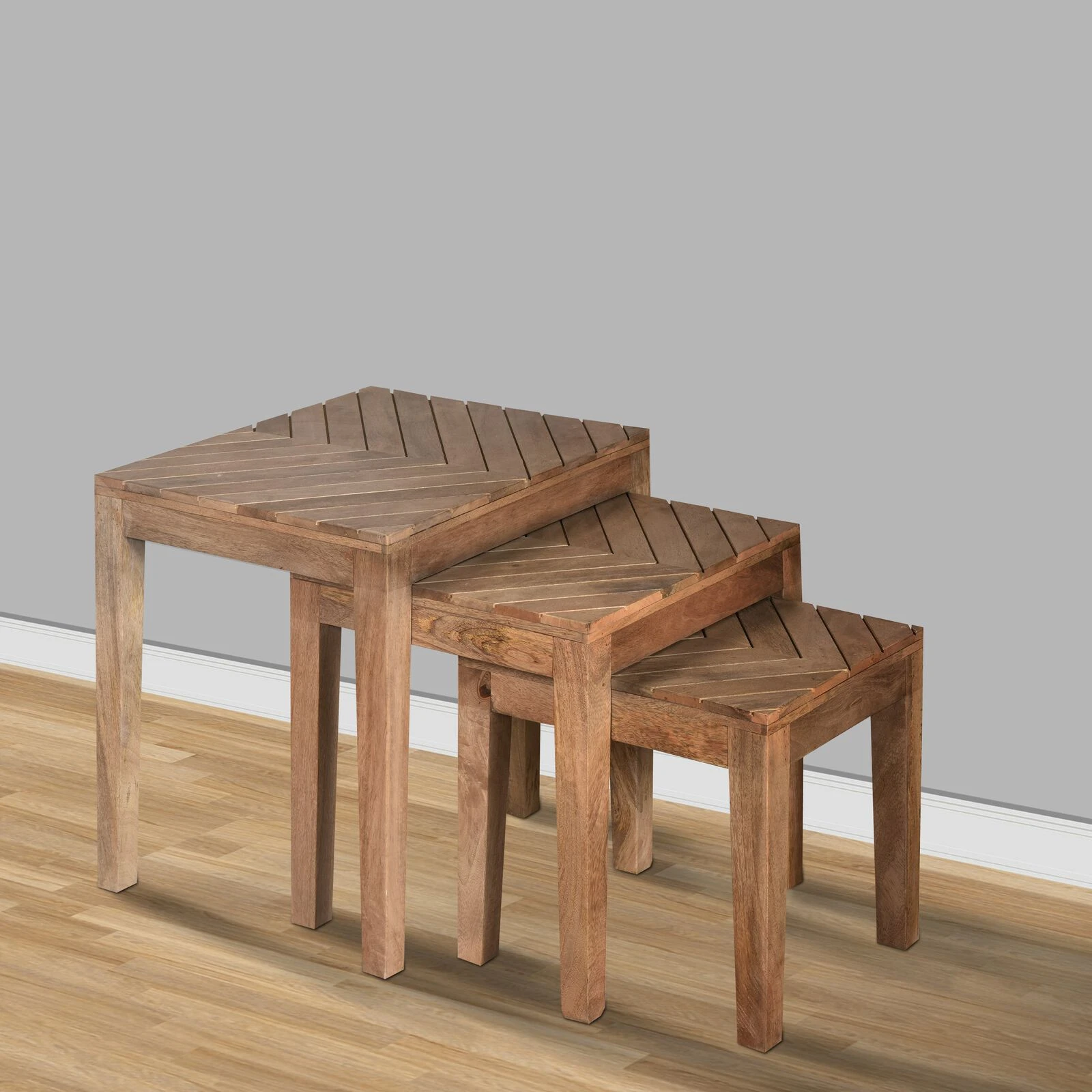 Meticulous herringbone design meets expert quality craftsmanship with this three piece wooden rectangular nesting side table set. Each with a rectangular silhouette, they showcase subtle wood grain details that harmonize with the vintage style natural light brown wood finish. Handcrafted from a mango wood frame and durable MDF, each table is supported on sturdy straight legs for stability and a minimalist design. The tables have a streamlined shape that work great in smaller spaces. You can even use them as accent tables to showcase your curated decor such as plants, collectibles, table books, vases, and more. This set can also be paired with your sofa or accent chairs as a perfect complement in your living room, lounge, den, bedroom, or other sitting area.