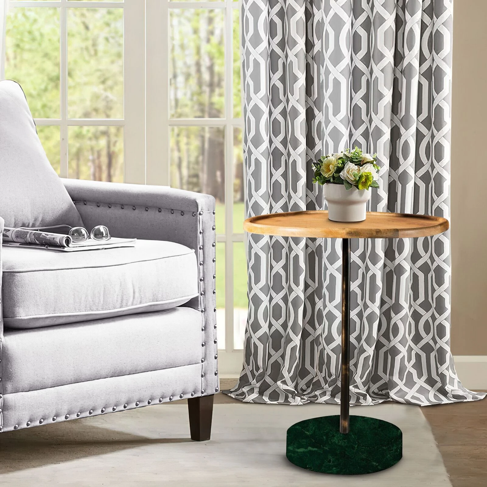 - Sturdy round marble base embellished with dark green finish