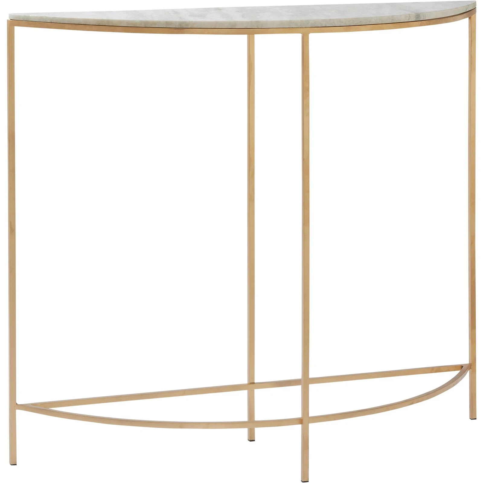 This side table provides your modern interiors and stylish and sophisticated uplift. It comprises a natural white marble top held in place by an iron frame that is gold plated. Beyond functionality and durability this demi-circle console offers a touch of regality to your home.