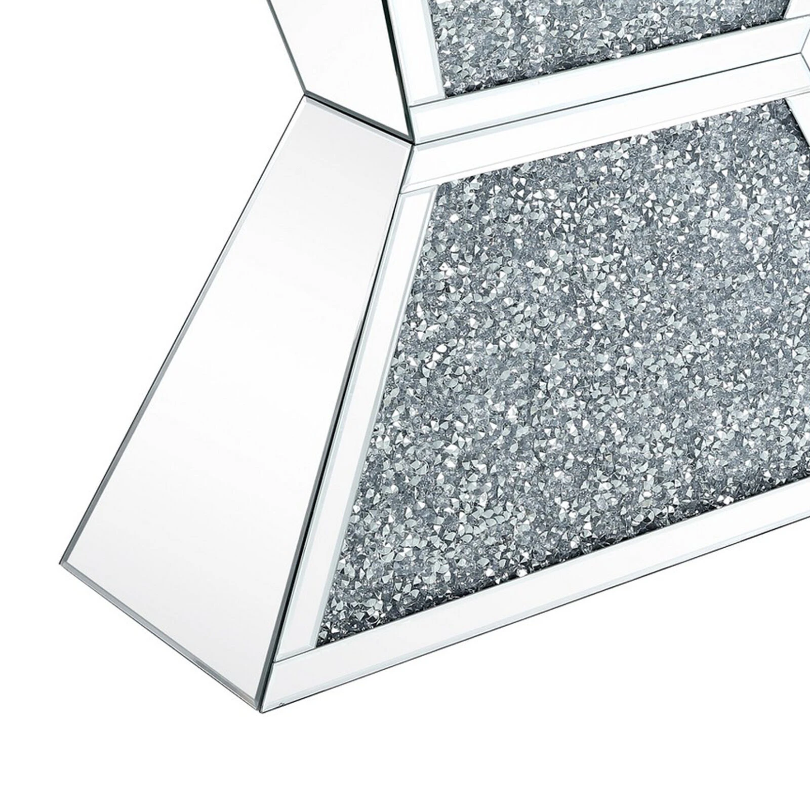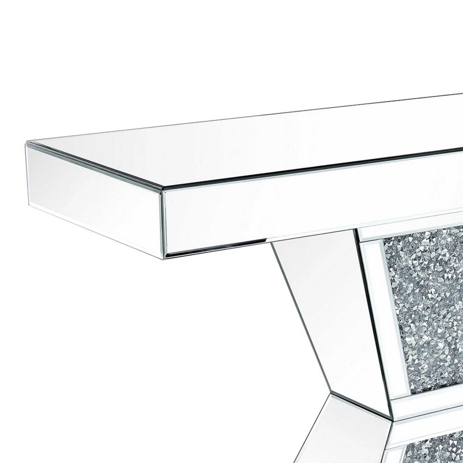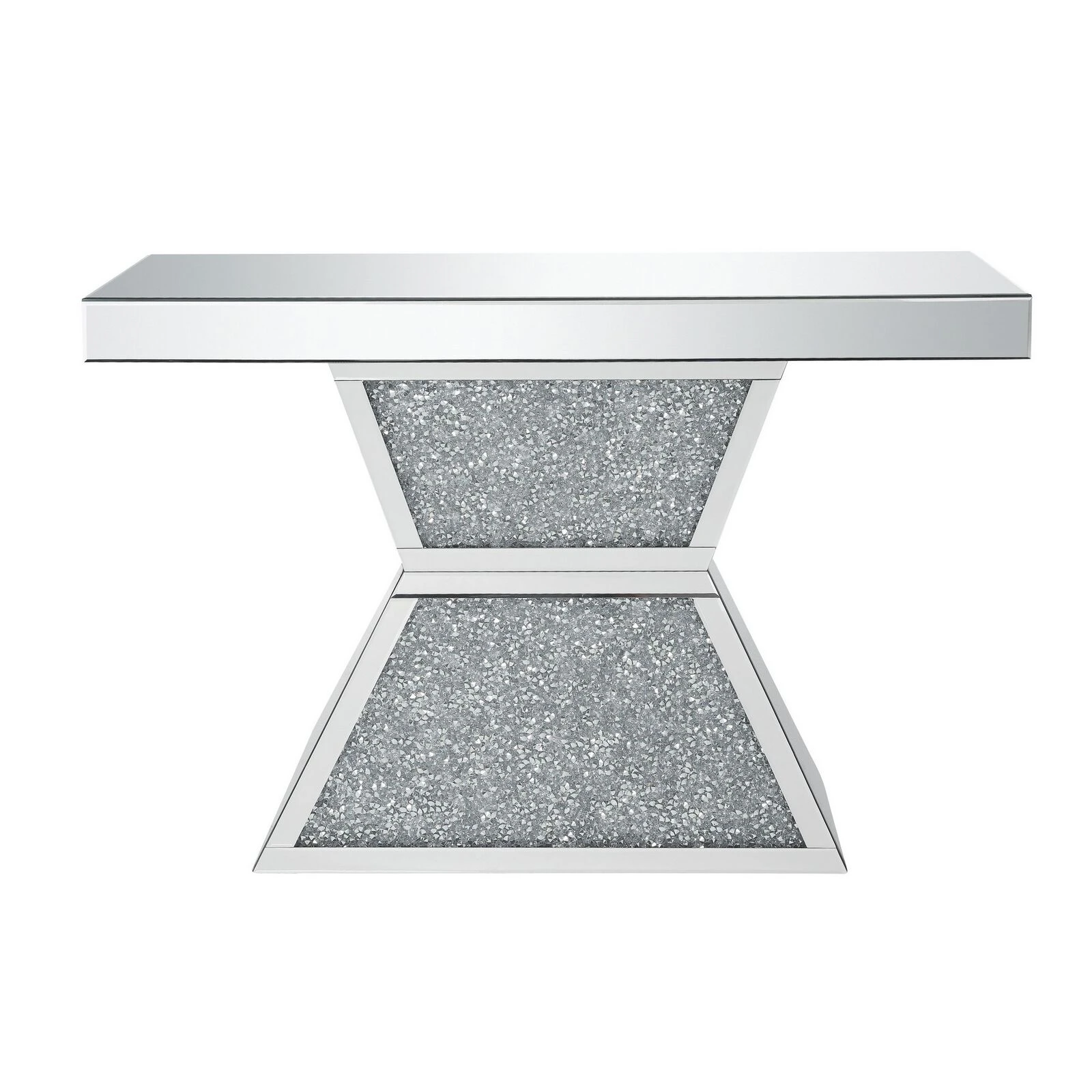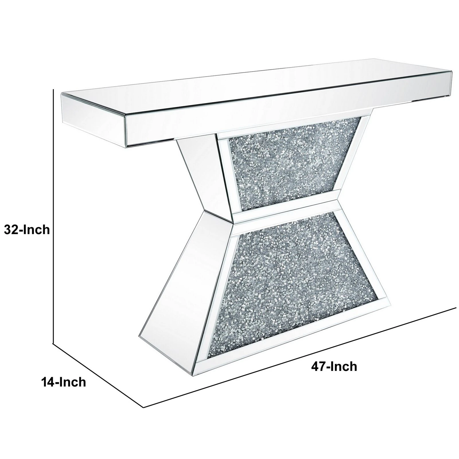 Exquisite craftsmanship meets contemporary style with this Console Table, that comes with a rectangular glass tabletop and mirrored pedestal base. Incorporated with faux gemstone inlay, it is sure to create an enthralling appeal by its mere presence.