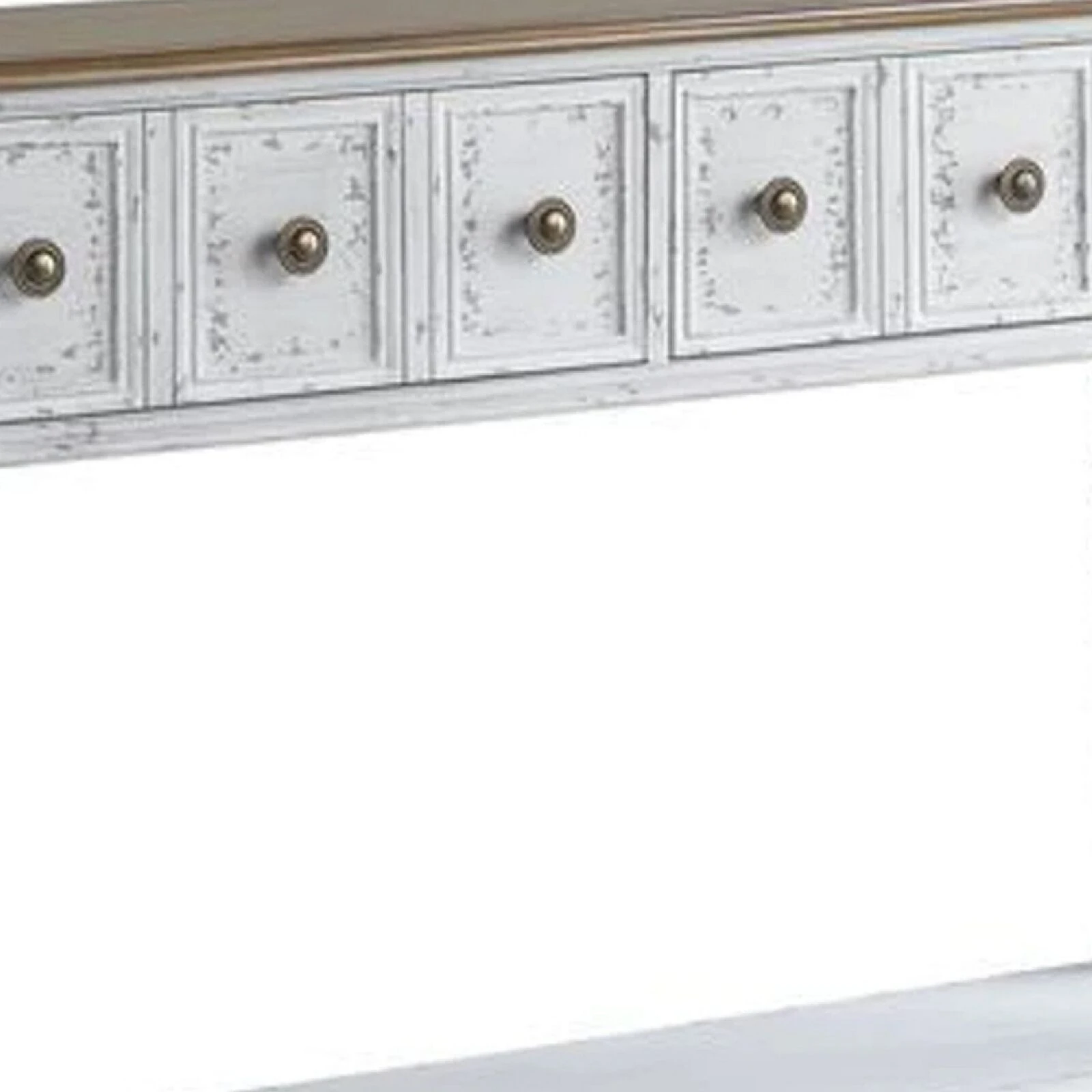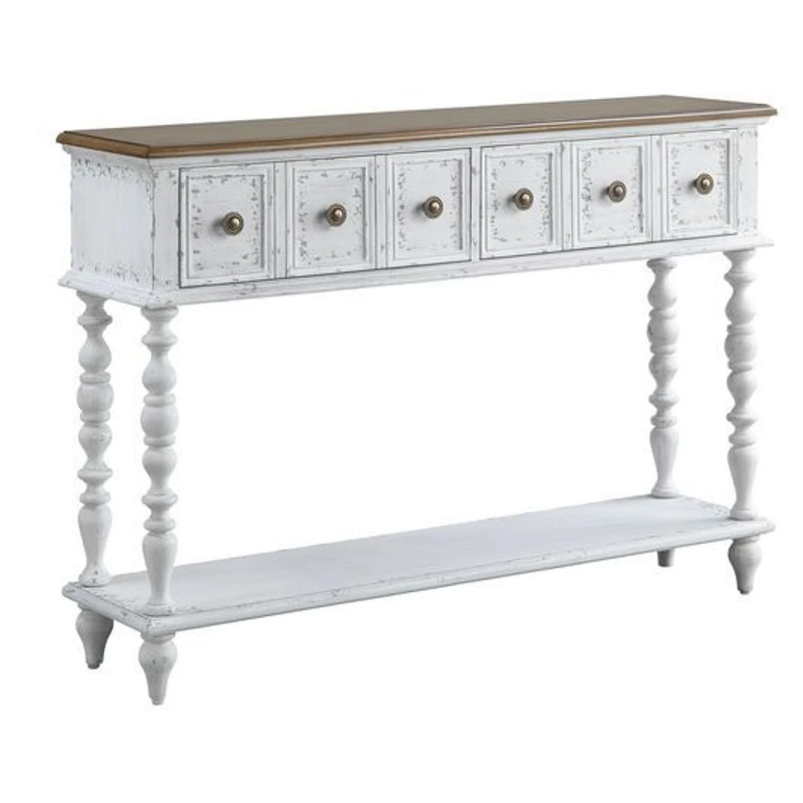 Give your interiors an earthy and rustic flair to your hallway or study with this distressed white, perfectly traditional two drawer console table. This table comes equipped with metal knobs on the two drawers and wooden glider tracks for smooth and durable drawer movement. Comes with a wood support at the bottom that doubles as extra storage.