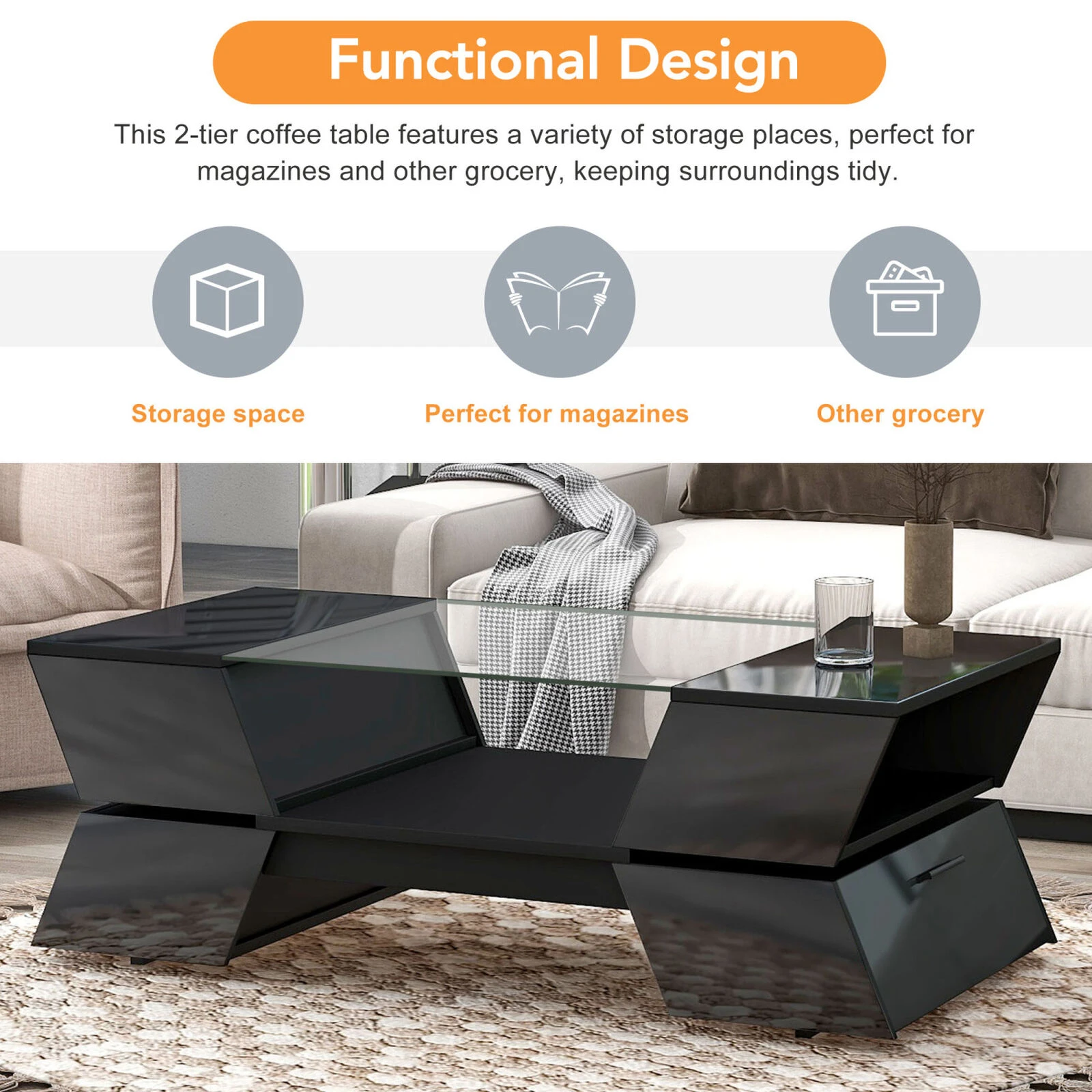 This coffee table is a stylish and practical addition to any room, with its unique geometric design, high-quality tempered glass top, low maintenance features, and easy assembly.