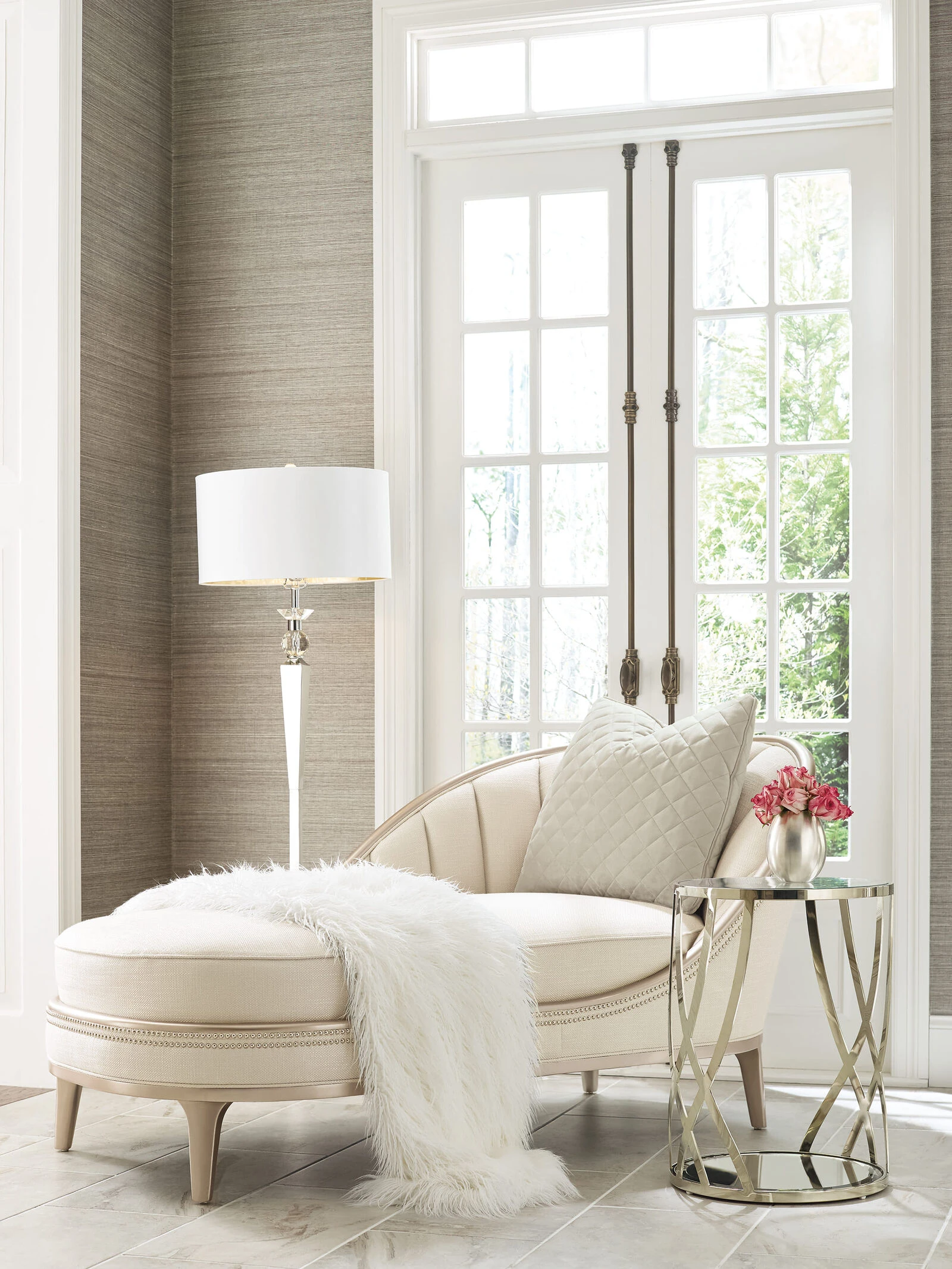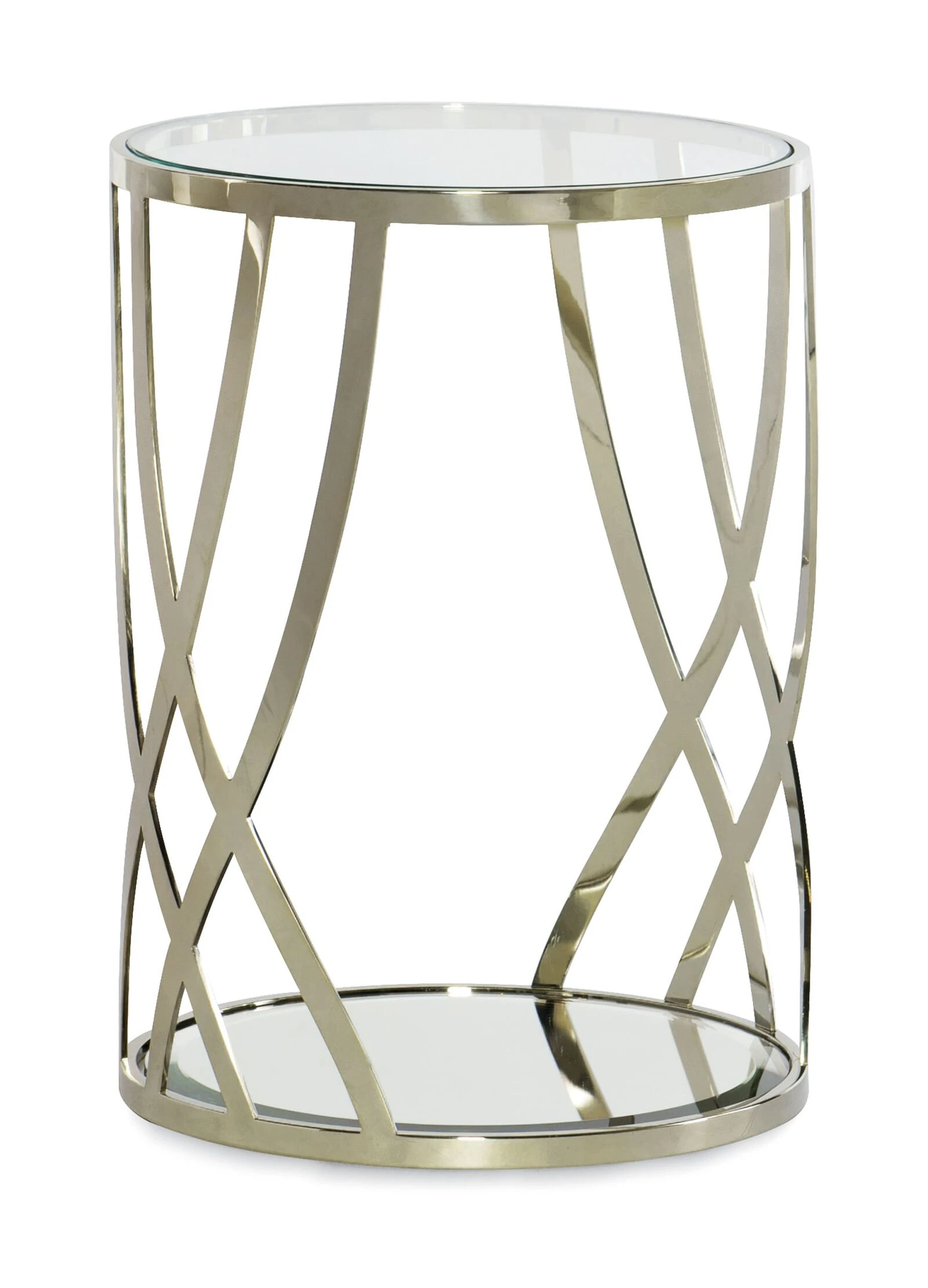 Finish off any sofa by pairing it with The Adela Round Table. Only 16-inches in diameter, this accent table has a contemporary woven Whisper of Gold metal frame that is topped in glass and features a beveled mirror shelf at the bottom. This petite piece is the perfect gem to add to any sitting area.