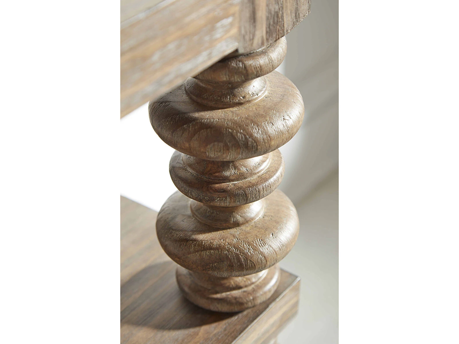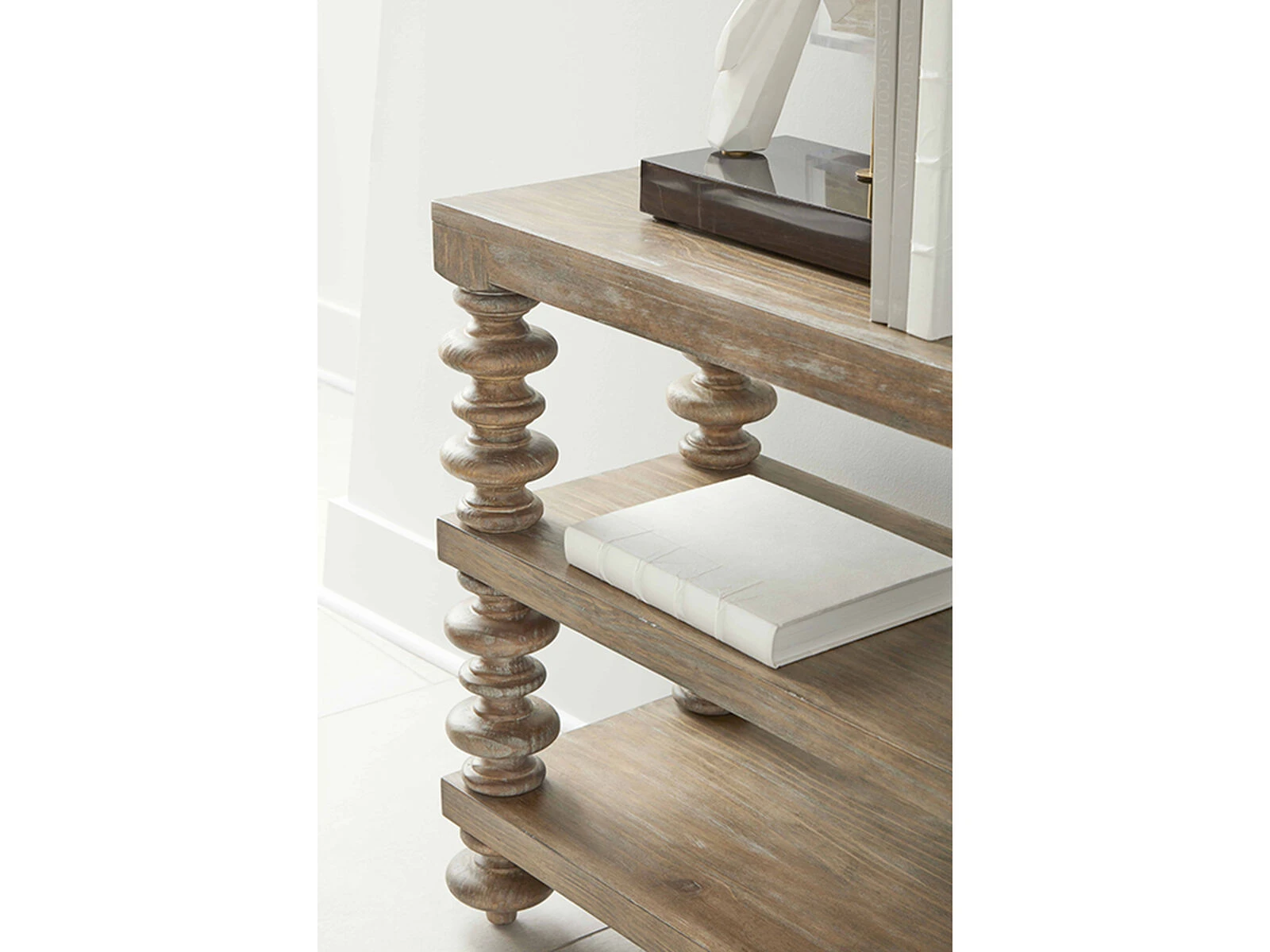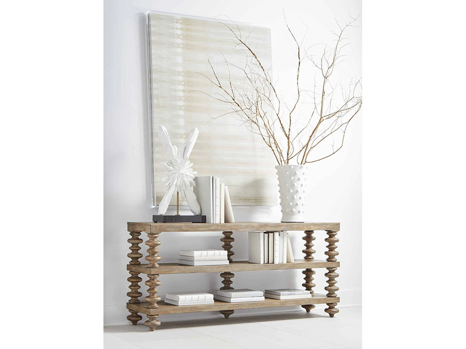 The elegant turned legs of the Architrave Console Table, a hallmark of the neoclassically-inspired Architrave collection, support a 72-inch top and two open shelves that can be used for storage or display. This handsome piece combines historical form and rustic charm in a casual classic style, and can be used as a narrow table behind a sofa or in a hallway.