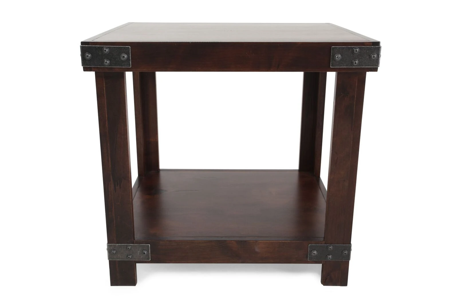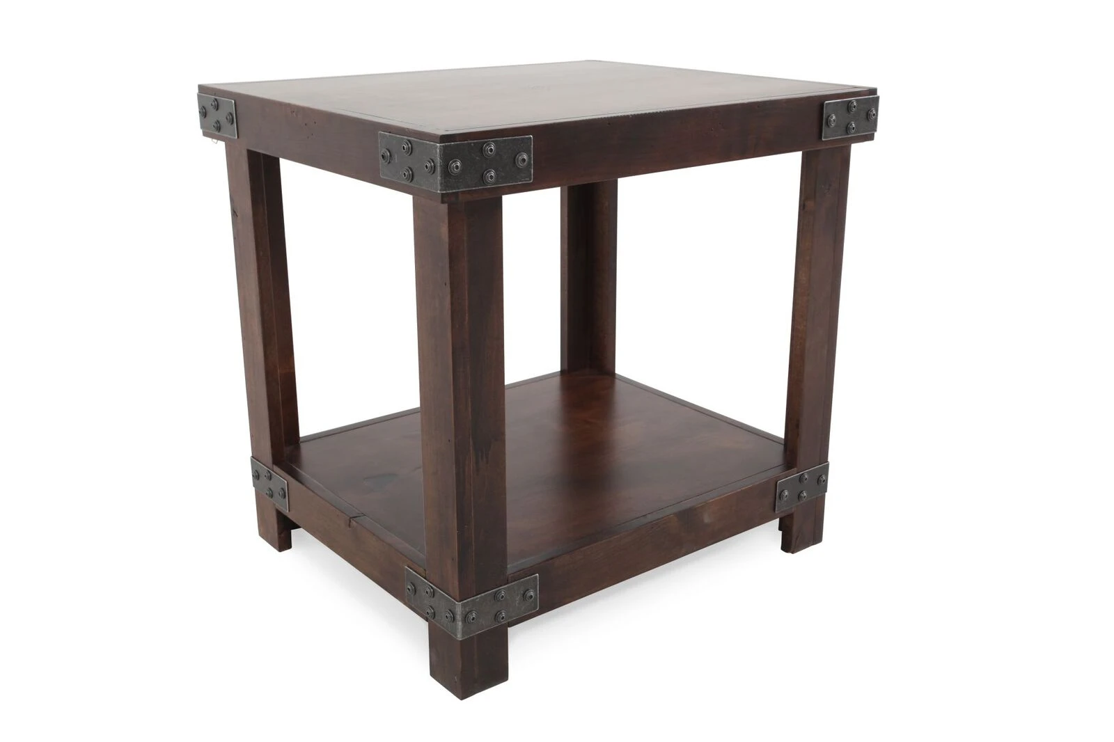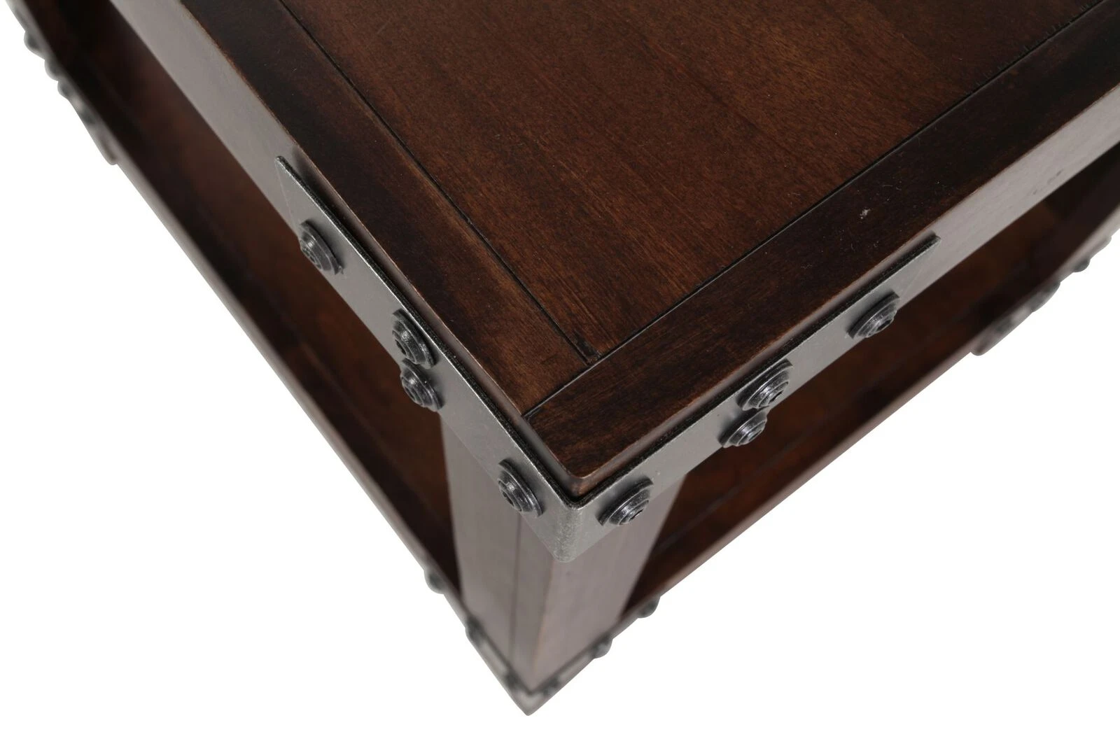 This Square Nailhead Accented End Table in Fruitwood is made of Alder solids and veneers, in a handsome fruitwood finish showing wood grain details. The past is recalled by its clean lines, distinctive metal corner brackets with nailhead accents, plank-style top and large open display shelf.