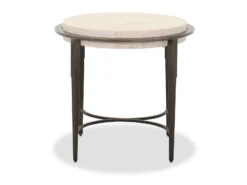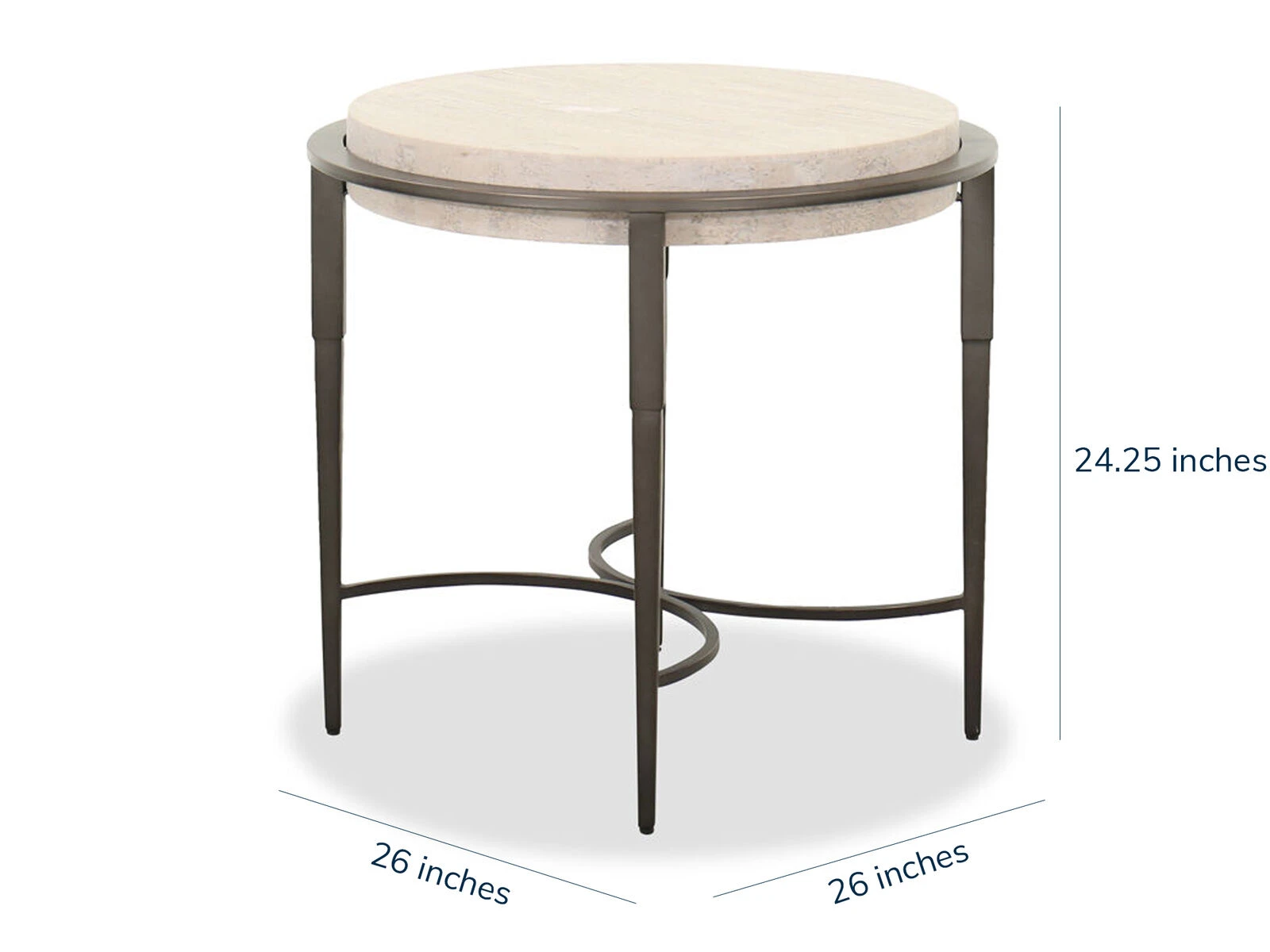 Visually intriguing, the Barclay Round Chairside Table is ideal for living rooms that demand elegance and sophistication. This living room table features a honed travertine stone top and steel-plated legs with stretchers. Attractive white-tone of the top along with the antique pewter finish of the legs and stretchers accentuates this chairside table. Crafted to perfection, this transitional chairside table elevates the style-standards of your living room.
