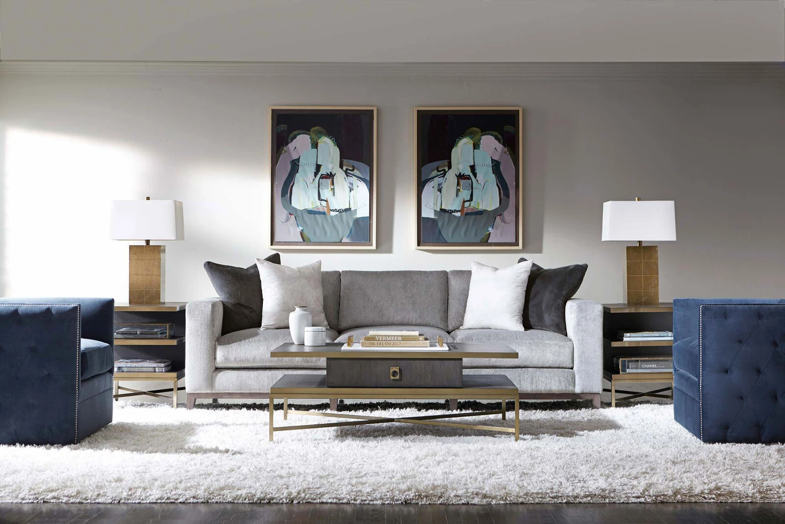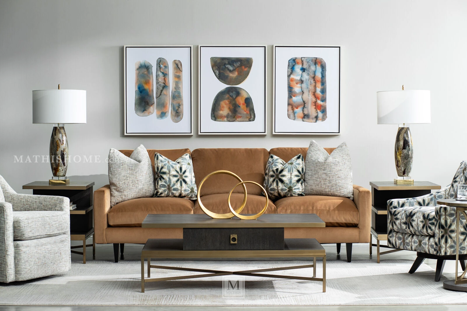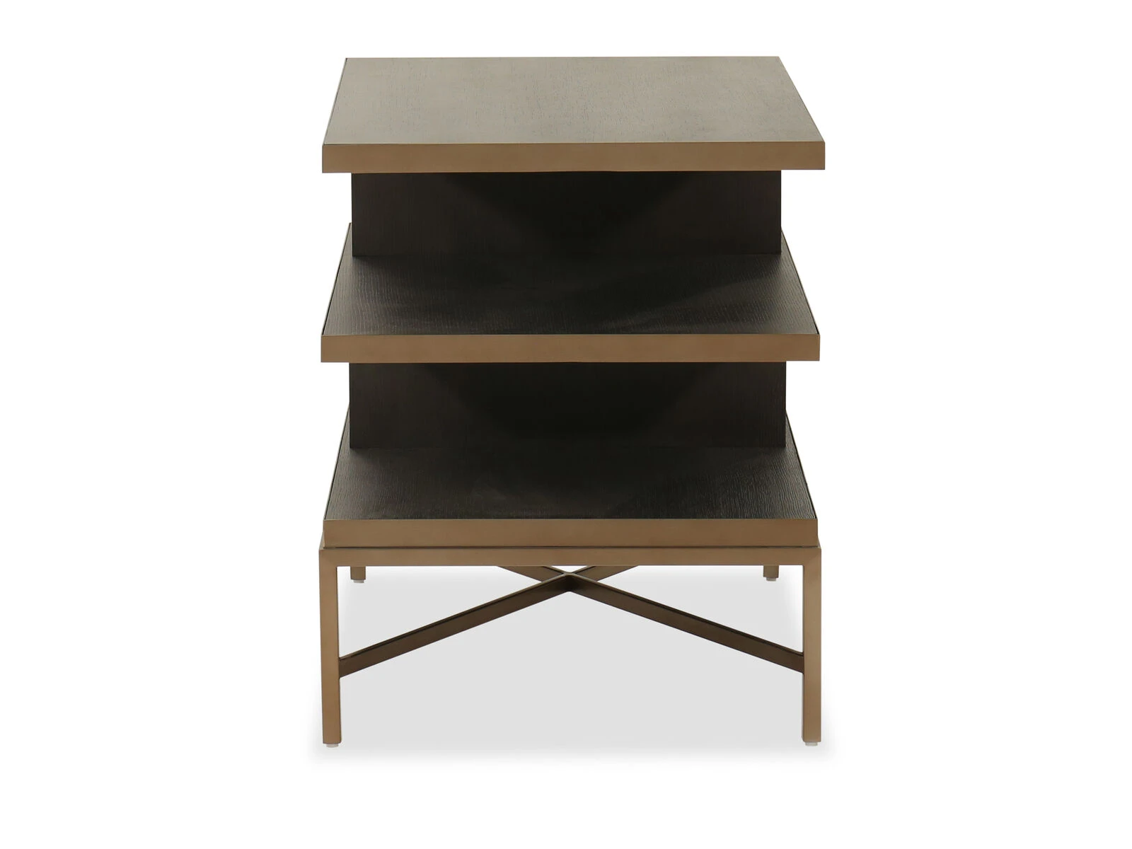 Complement your living room furniture with the Beaumont End Table. It boasts a wide top and two shelves underneath for maximum storage. A convenient spot to place drinks, books or decorative items, it can be a great accompaniment to chairs, sofas and recliners. This end table stands on a durable metal base with X-stretchers that provides firm balance. It features a visually pleasant blend of brown finish on quartered oak veneers and brass on the metal shelves and base.
