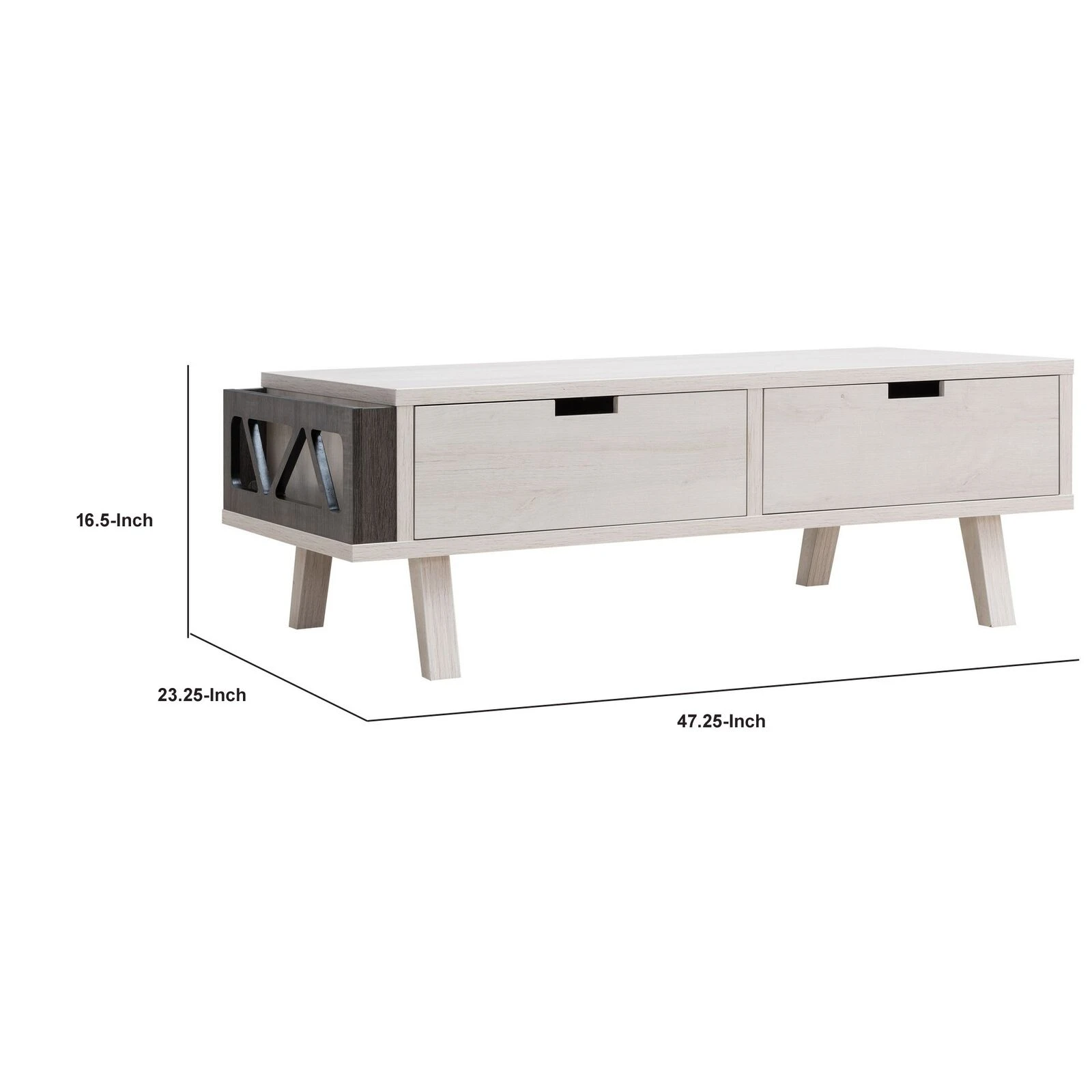 Bev 47 Inch Modern Coffee Table, 2 Drawers, 1 Side Compartment, White, Gray-Benzara