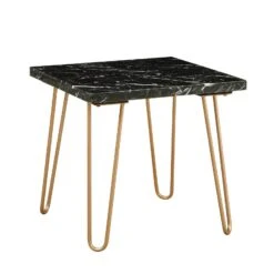 Black Marble Top End Table With Metal Hairpin Style Legs In Gold-Benzara
