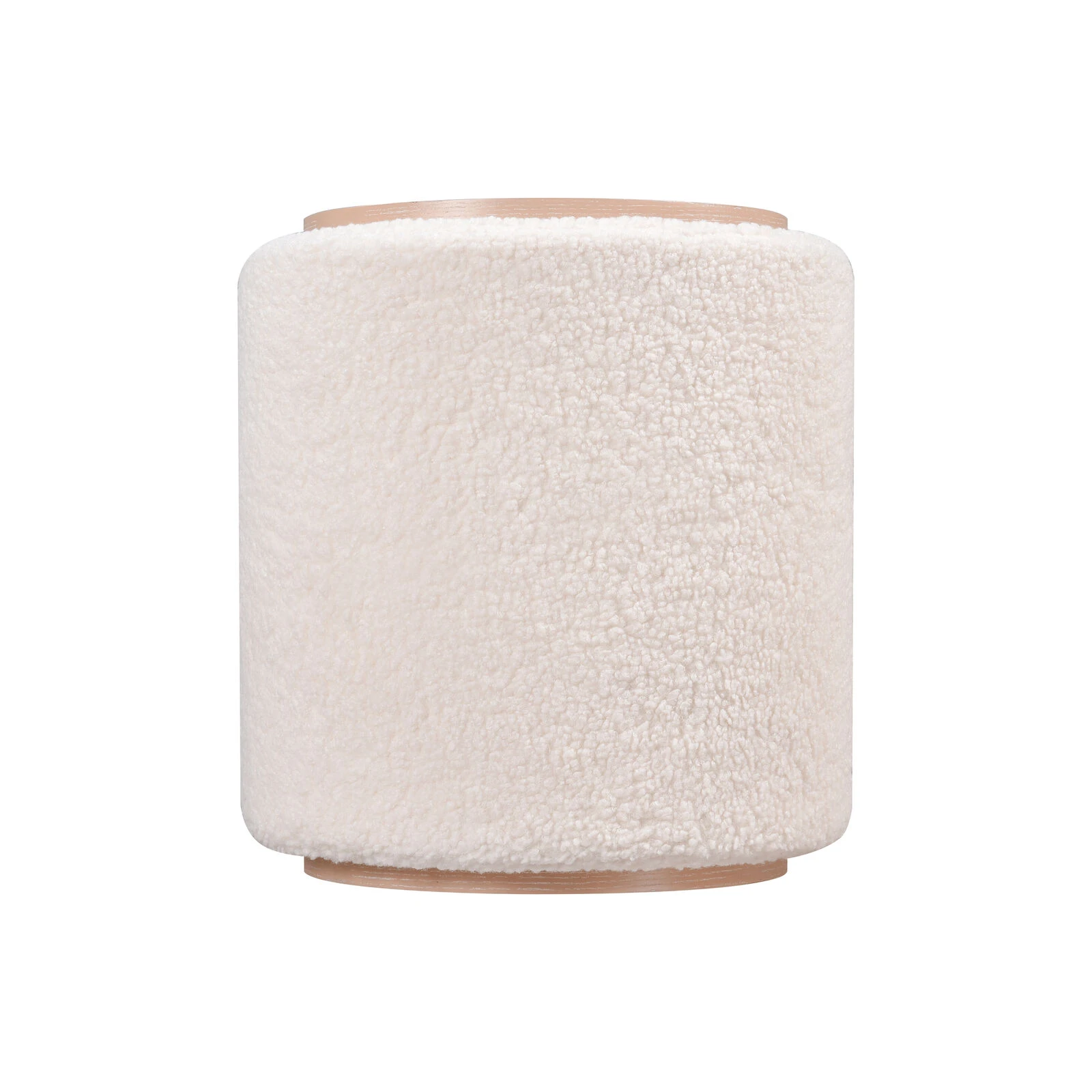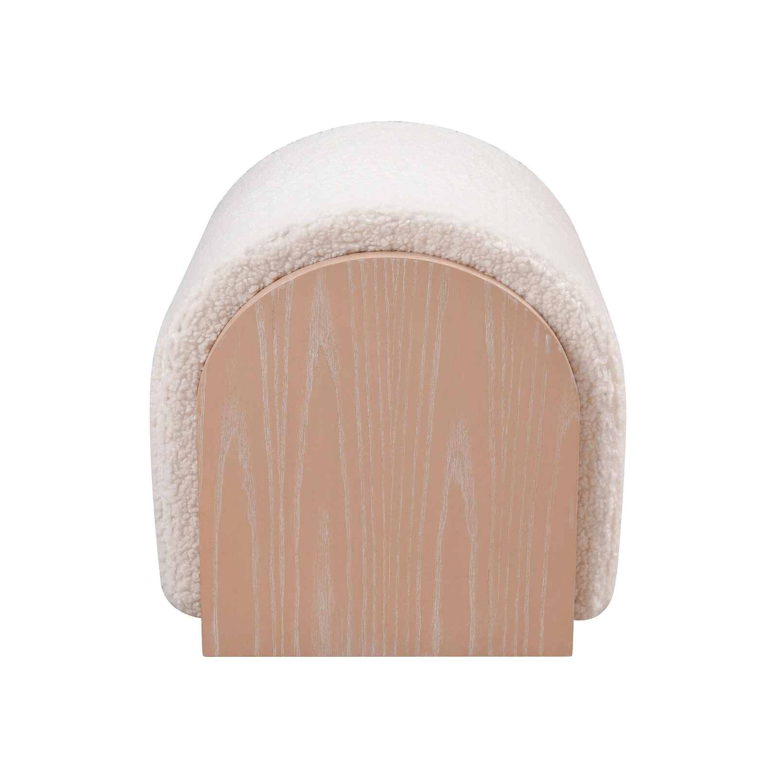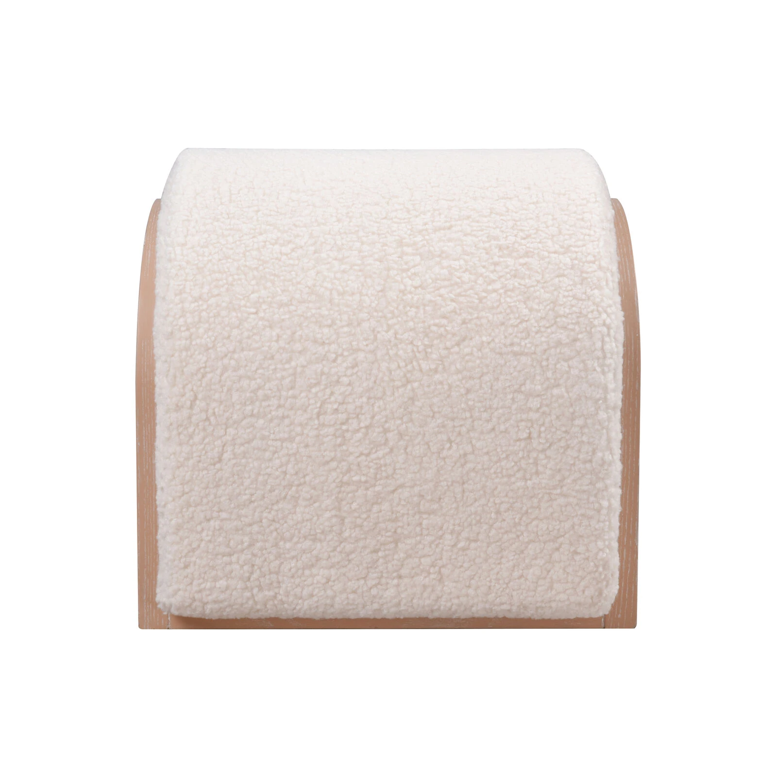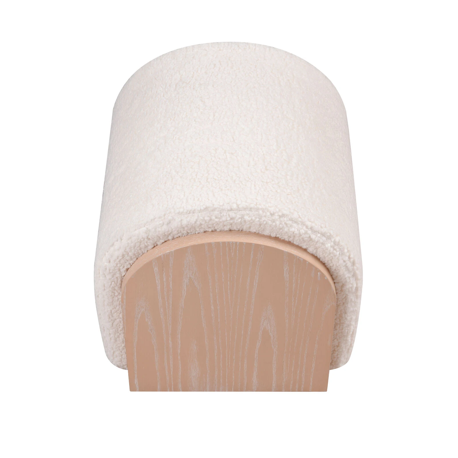 The Marko Stool has a unique demilune waterfall shape with boucle upholstery that folds down two sides. The curving white upholstery contrasts with the flat wood sides, creating a sculptural seat that works in a variety of room settings.