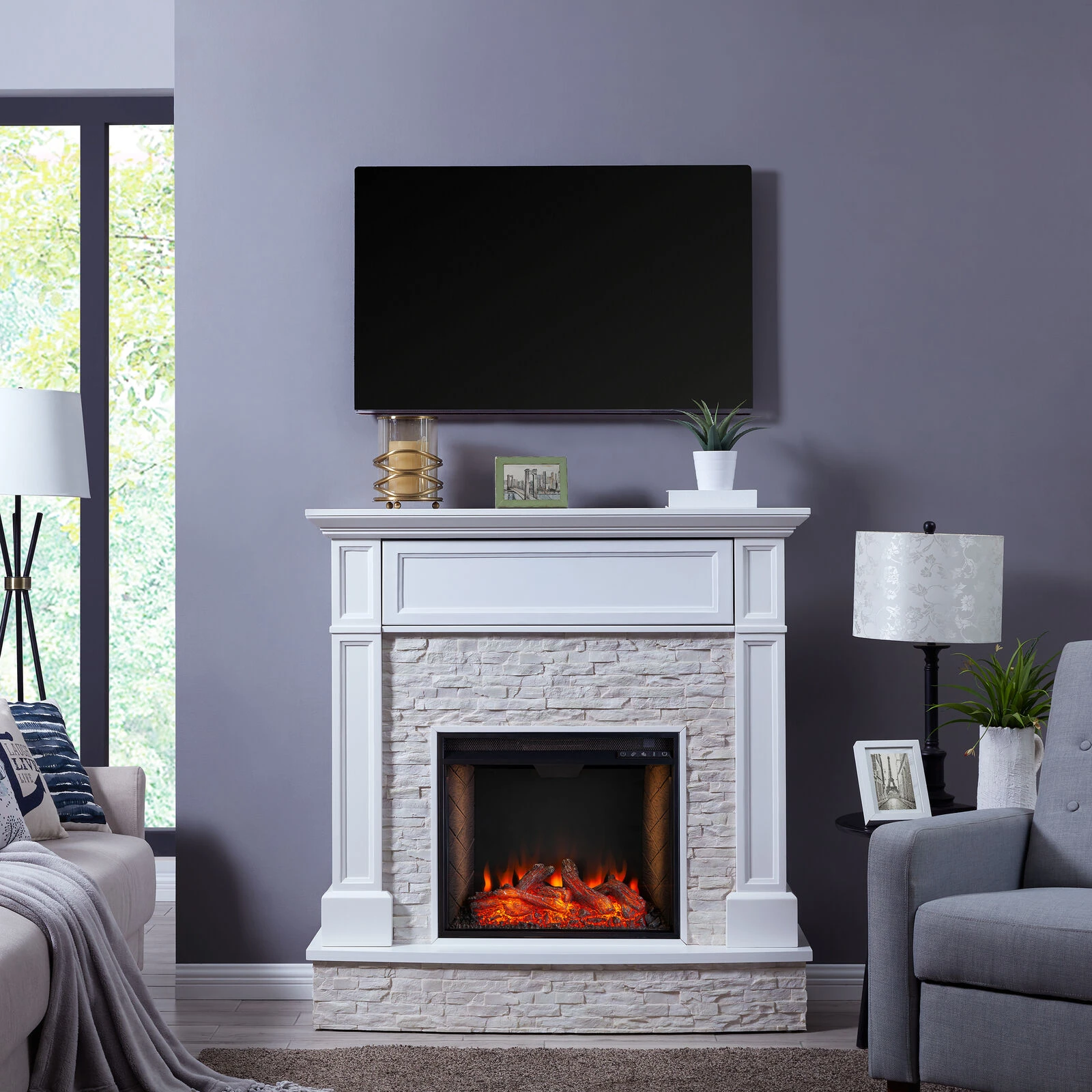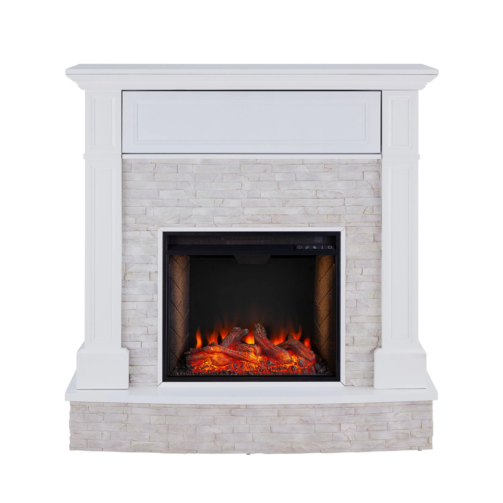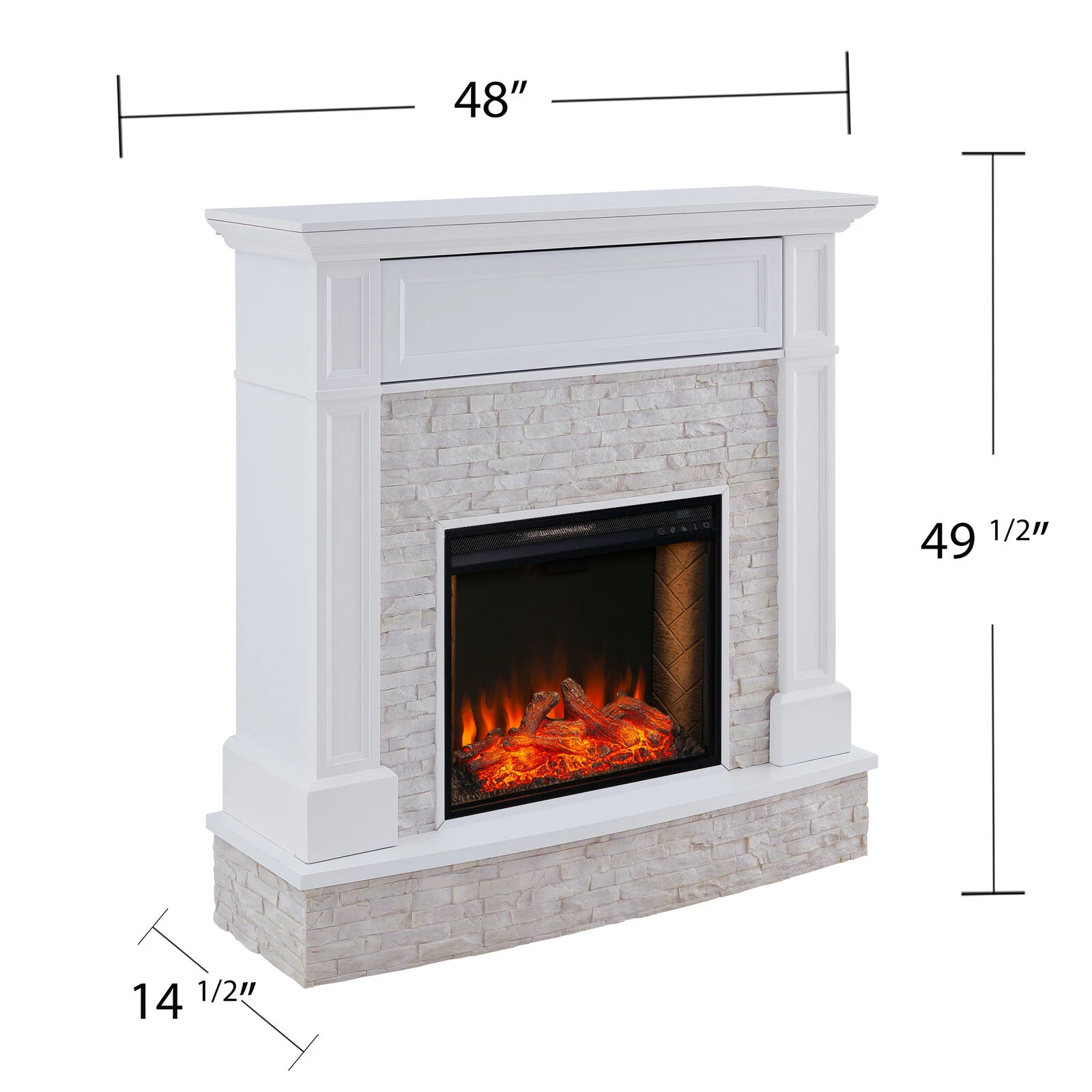 Warm up the heart of your home with this contemporary, faux stone media fireplace. Easily accessible hidden media storage provides a place for DVDs, books, or remote controls, while elegant faux stacked stone traverses the hearth and surround, adding height and sophistication. A faux brick firebox interior with lifelike flames and embers lights up a realistic fireplace look, with or without heat, and voice-enabled Alexa technology allows for seamless control from in the room. The clean white woodwork evokes crown molding style from the base to the top, giving this electric fireplace grace and charm. Designed as an entertainment console, this faux fireplace is beautifully convenient beneath a wall mounted TV.