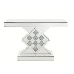 Add a contemporary touch to your home with this console table. It features a fully mirrored beveled frame with spectacular faux diamonds inlay that showcases an intriguing look. With the clean lines and unique open design pedestal base, this brilliant table showcases a distinctive style.