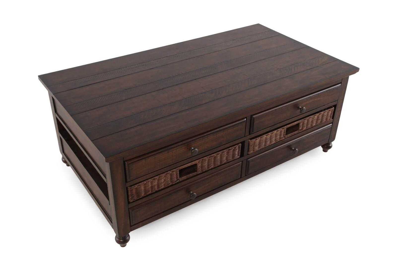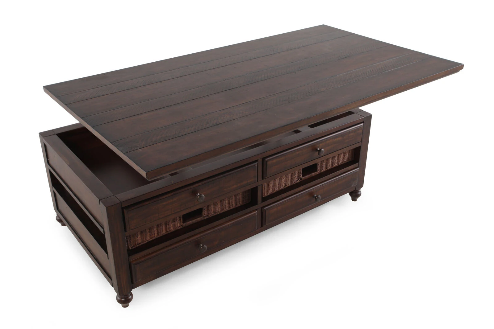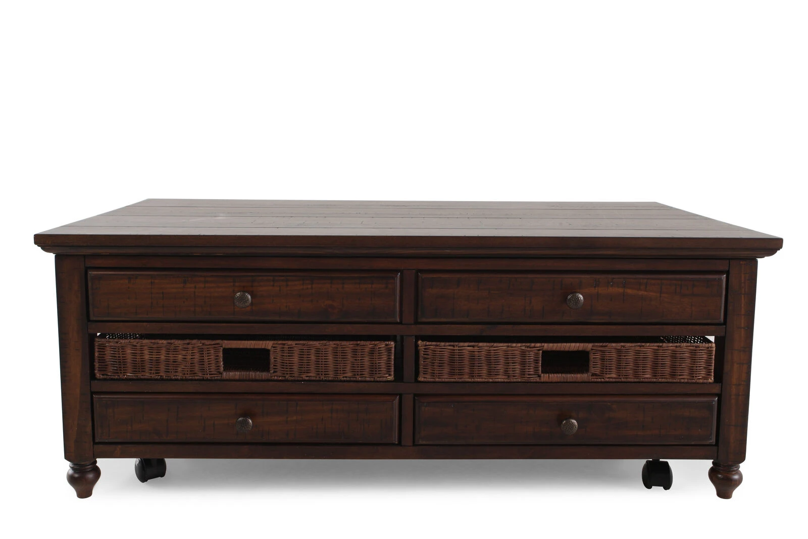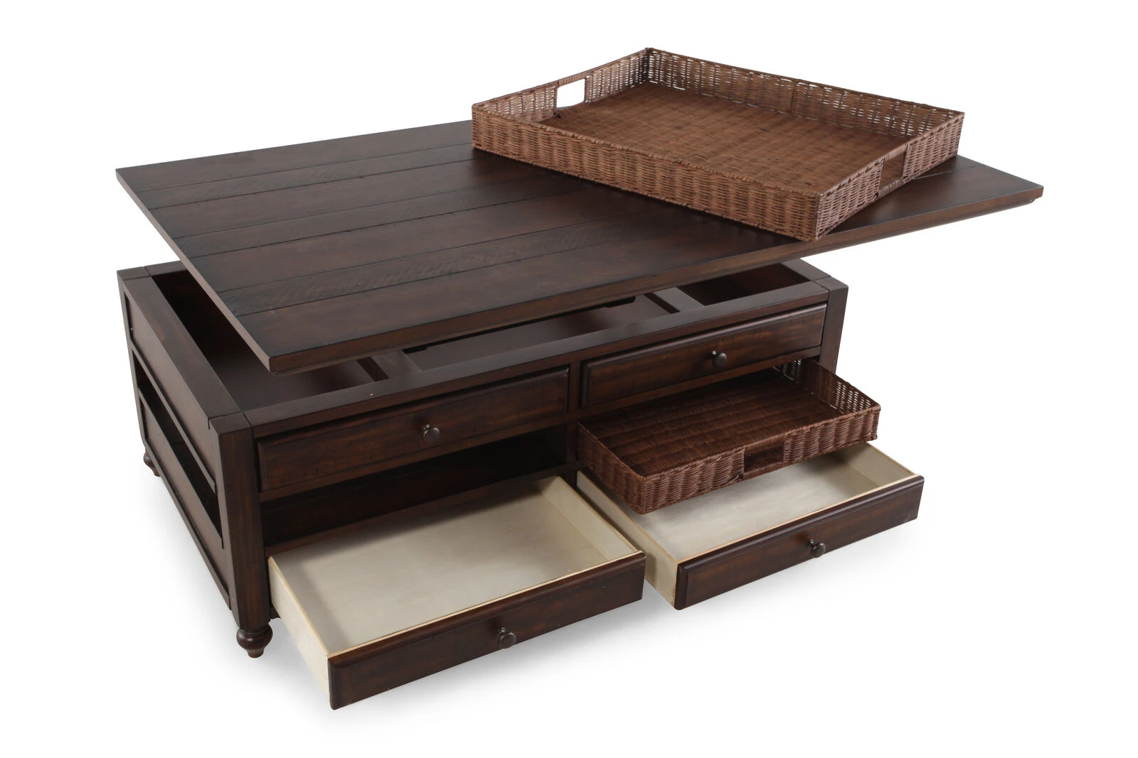 This Rectangular Lift-Top Cocktail Table in Dark Walnut is crafted from pine solids and pine wood veneers, bathed in a warm, dark walnut finish that reveals the beauty of the underlying wood. It has a planked top with a stepped edge, four drawers with hammered and weathered dark bronze pulls, and a large divided shelf that includes two removable rattan baskets. The top lifts up to make a handy extra table or work surface, and the table sits on extended ball feet.