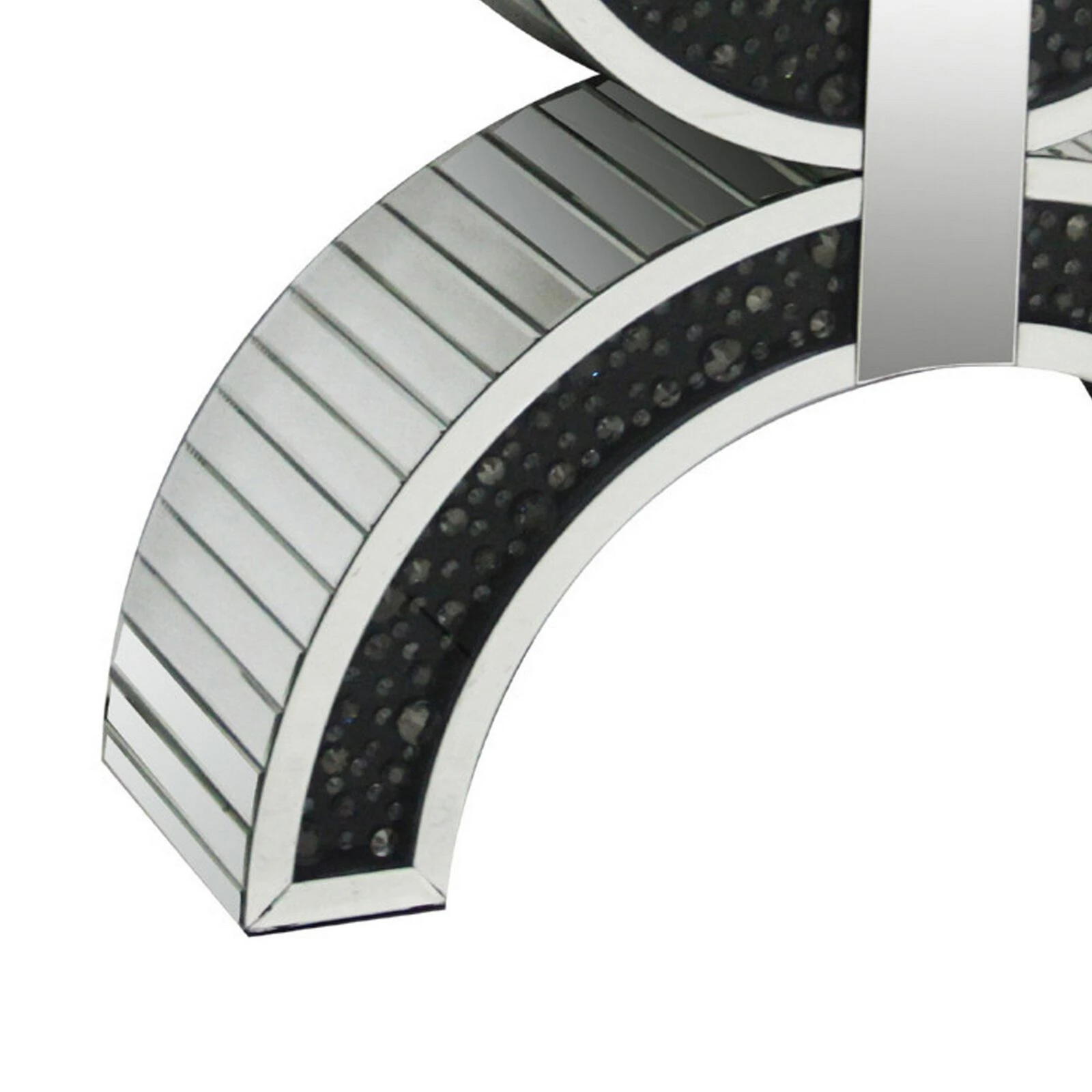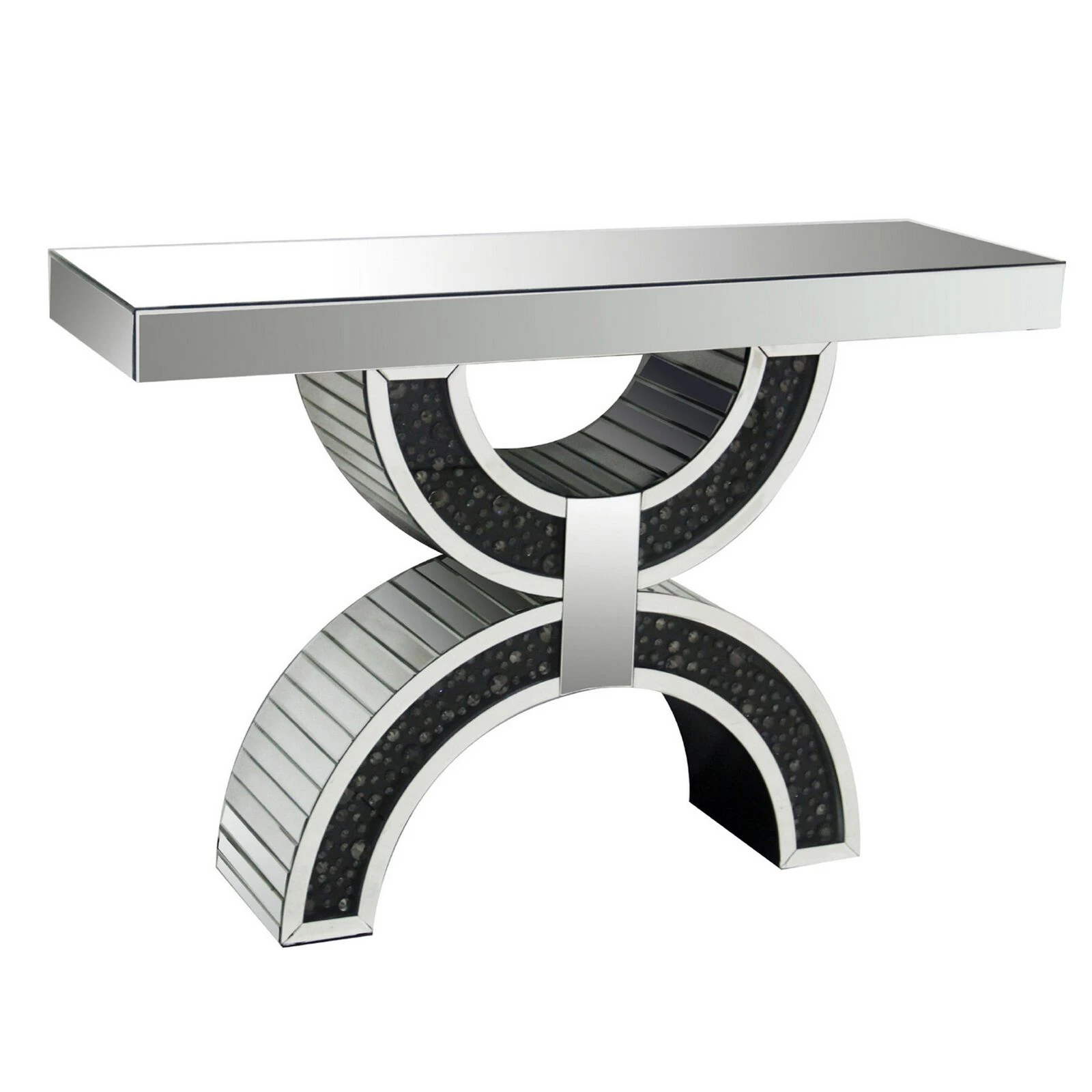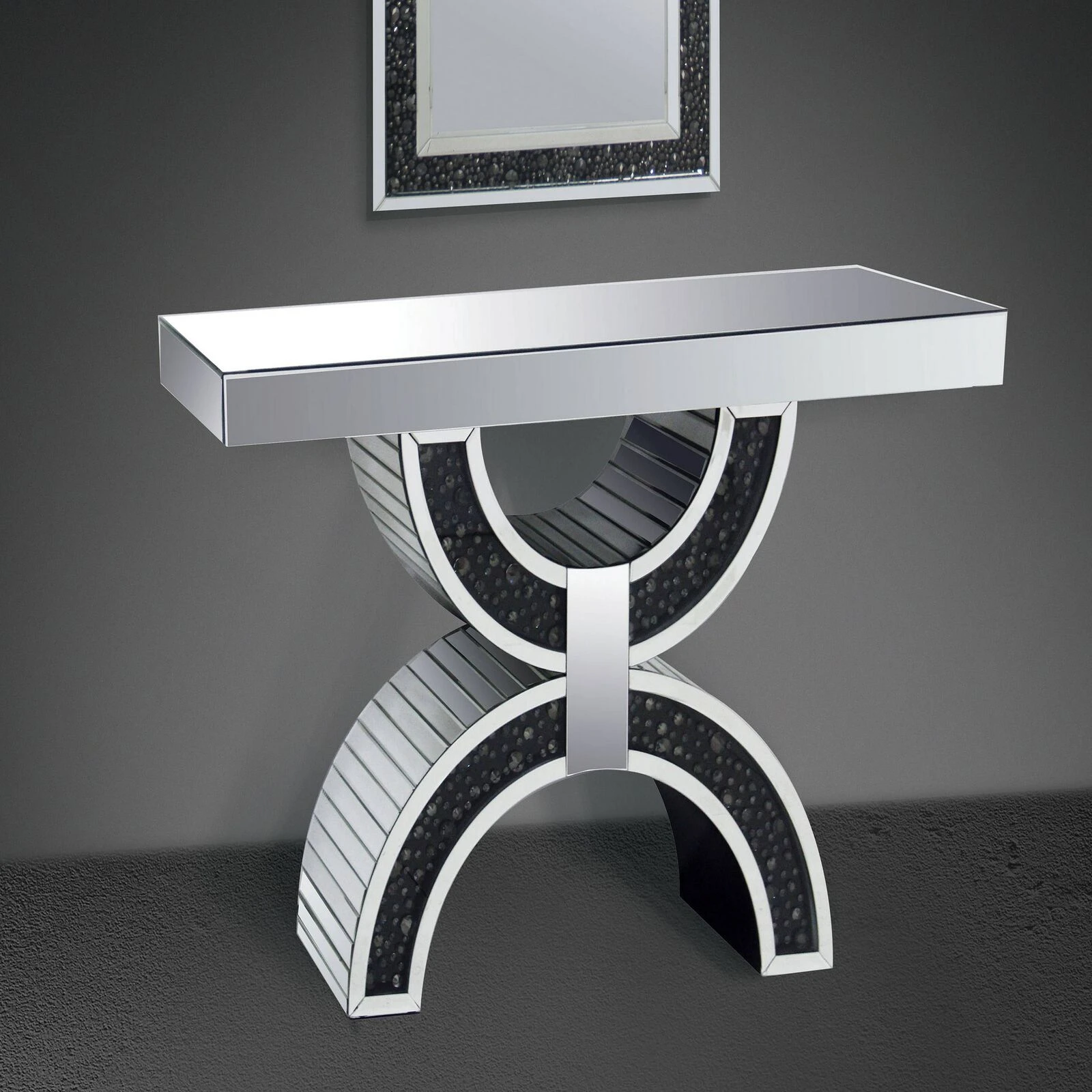 A geometric style base and clear acrylic panels filled with black faux crystals ensures that this Console will be the crowning jewel of your home. The table is constructed from durable Composite Wood materials and it is fully lined with beveled mirrors that reflect light and your modern design aesthetic. Add this Console table behind your sofa to bounce light around your room or place it in your entryway right by the front door so you can handily drop your keys at the end of a long day. Note Other featured items in image except this Console table are sold separately.