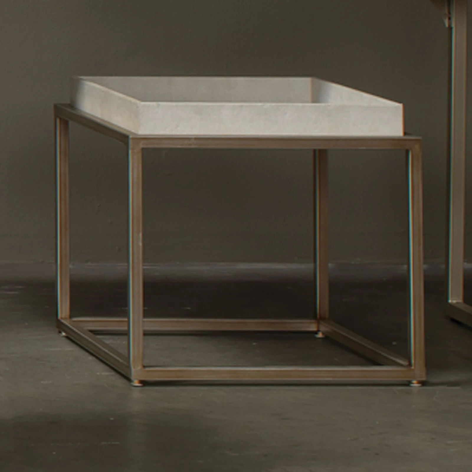 Add a designer-worthy touch to your space with this accent table. The airy metal base is made from champagne-finished iron and topped off with faux-shagreen. The stunning mix of materials makes for an eye-catching piece in any room.