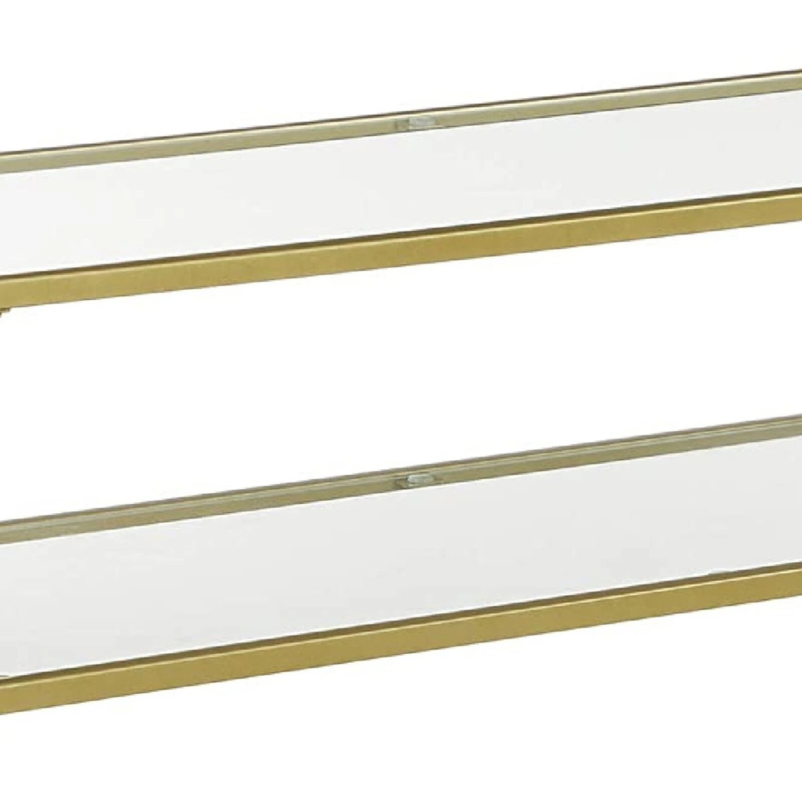 Kin 39 Inch Sofa Console Table, Metal Frame, Tempered Glass Shelves, Gold
