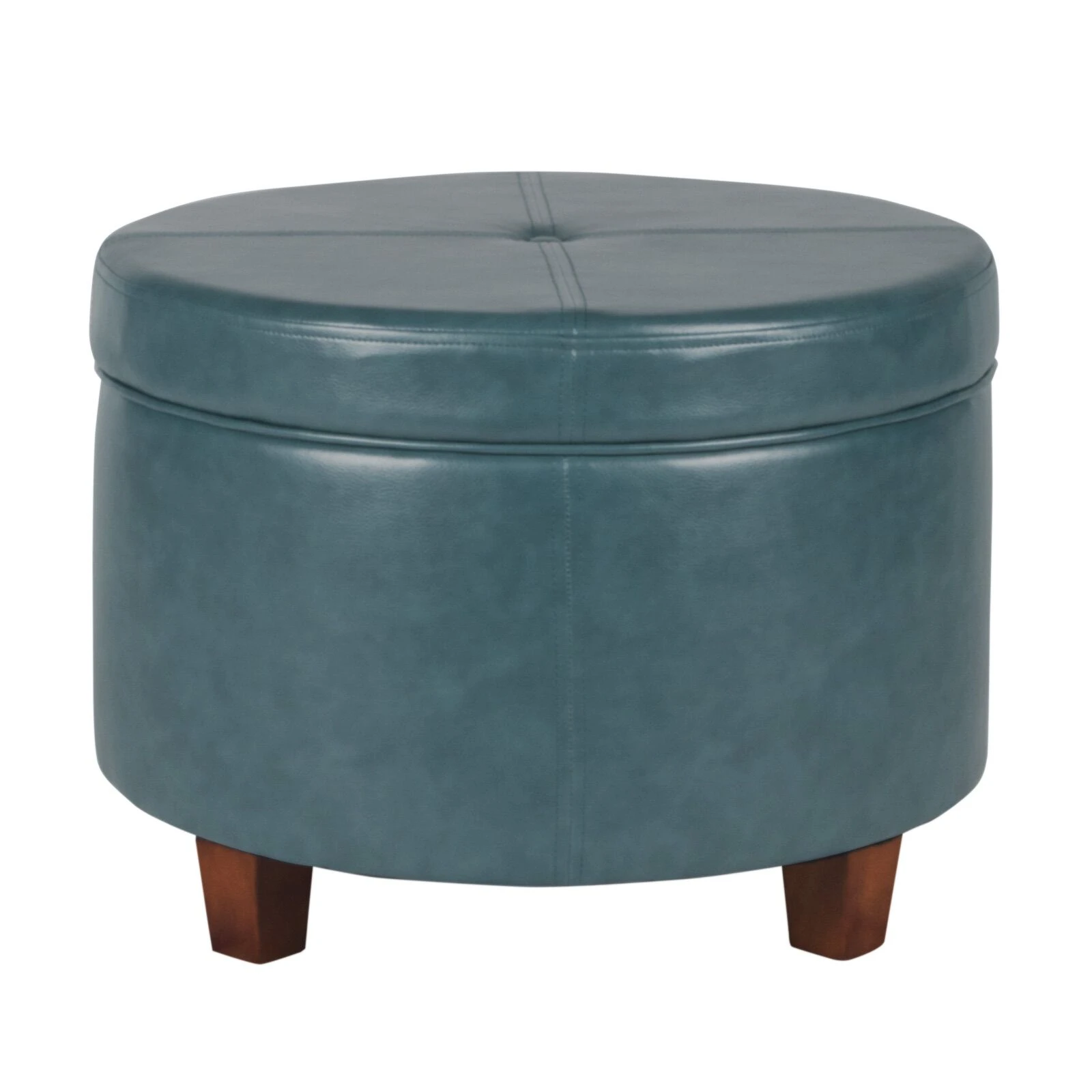 This beautifully finished ottoman will bring a fusion of beauty and style to your furniture setting. Made up of wood frame and draped with faux leather, this large sized round storage ottoman offers a timeless style and storage together. Upholstered in vibrant teal blue color faux leather with rustic brown finish wooden tapered feet, it has single button tufted lift off lid for quick access to storage within. Use it in your living room or family room to keep remotes, magazines or toys in it or put in your bedroom to hide extra pillows, blankets and other accessories under it.