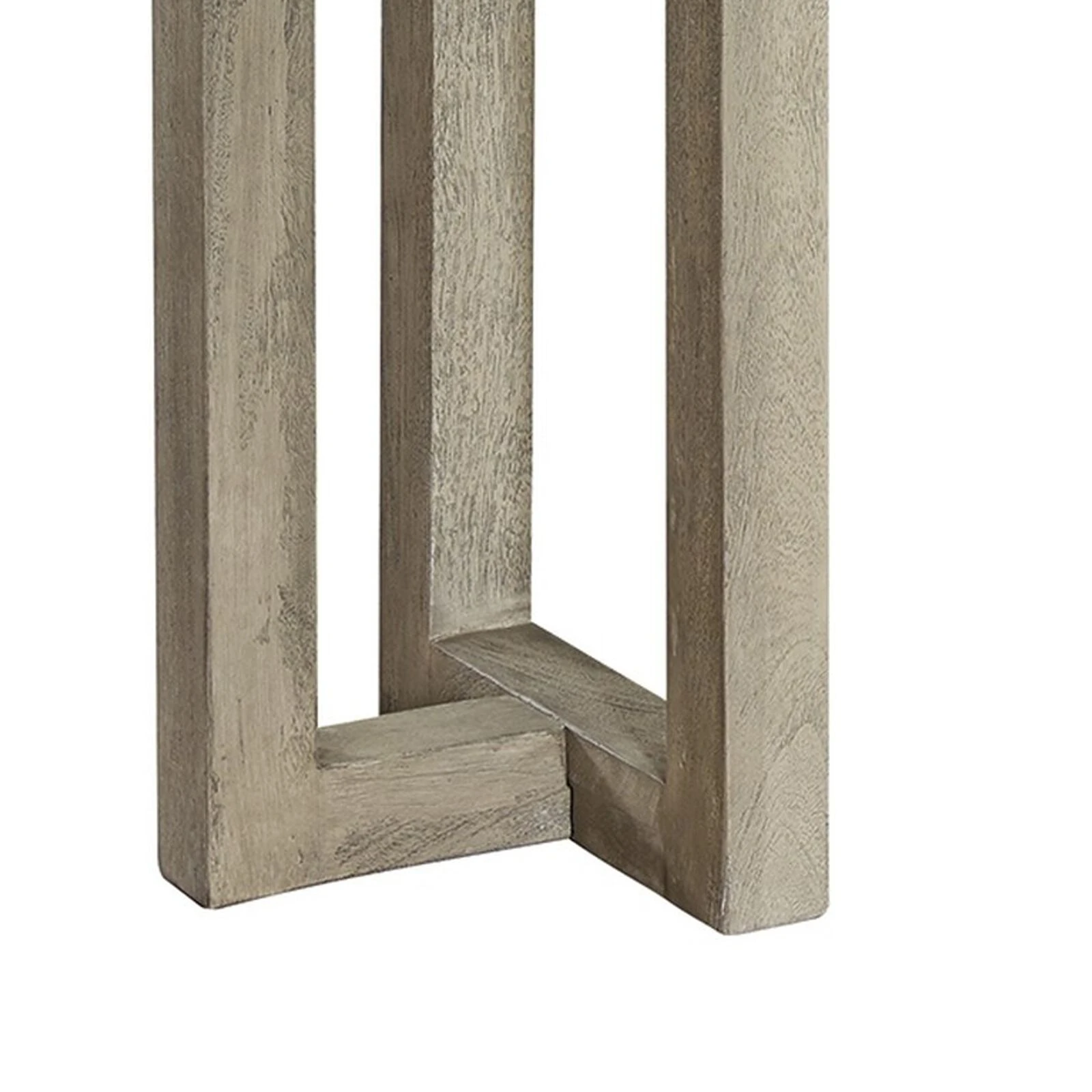 Warm in appearance and wonderfully crafted, this sofa console table is a visually fascinating piece for any modern entryway or living room. Crafted from a combination of engineered wood and mango wood, it has a cement like gray finish for a striking and industrial touch while the intersected legs add a twist to its otherwise minimalistic design. Check out our Lizi collection for matching items.