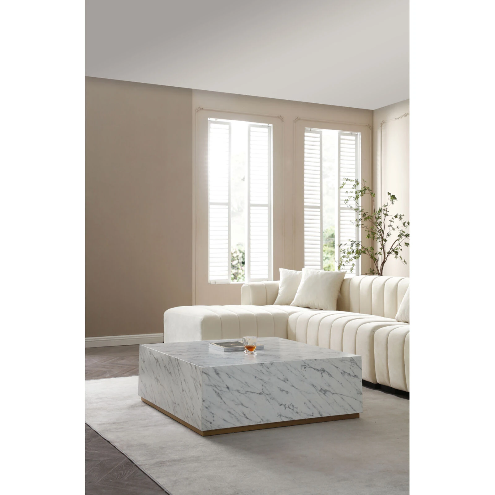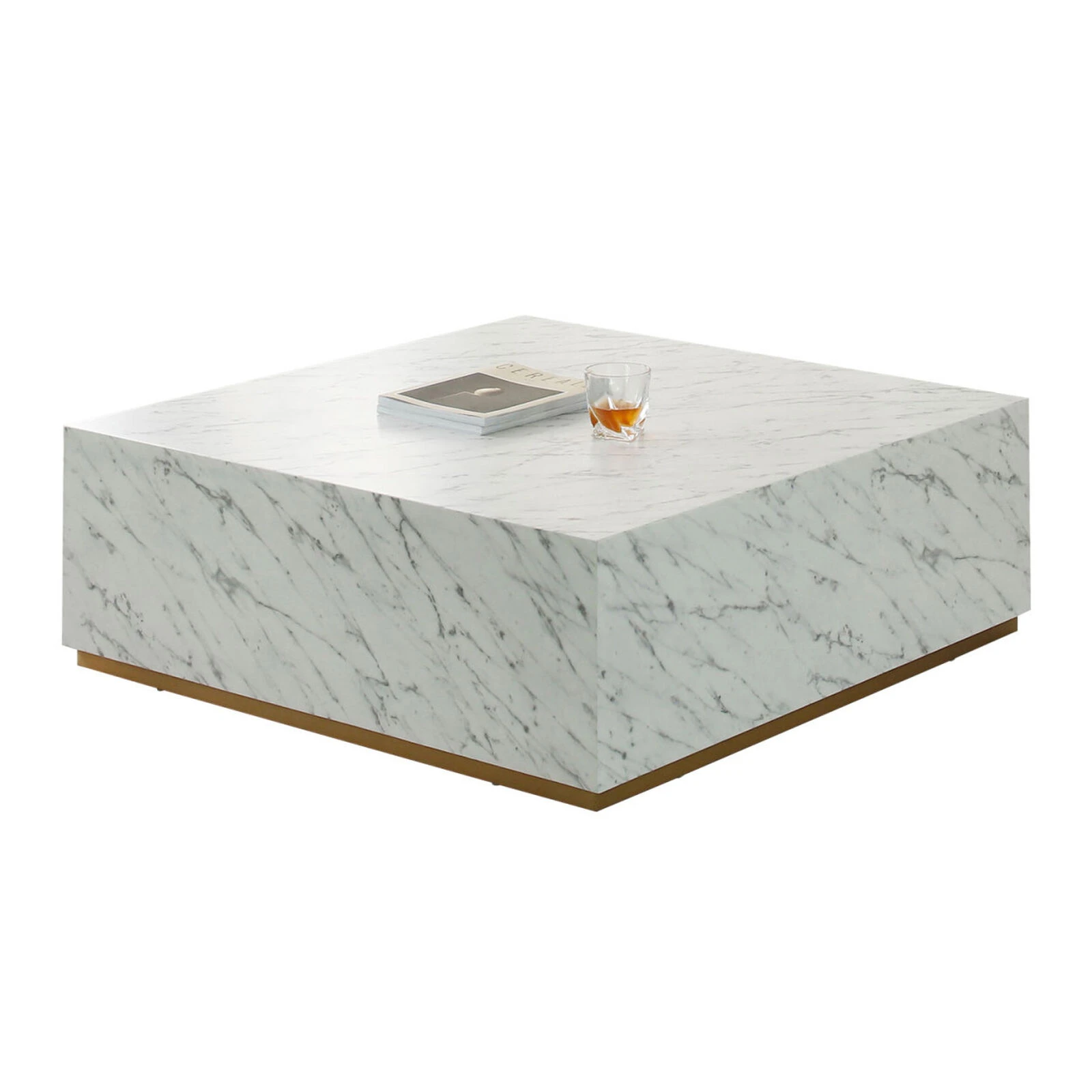 This oversized coffee table with a gold base is designed to be the centerpiece of a stylish living room or home theater. It is available in black and white marble finishes, and requires no assembly, making it a convenient and elegant addition to any space.