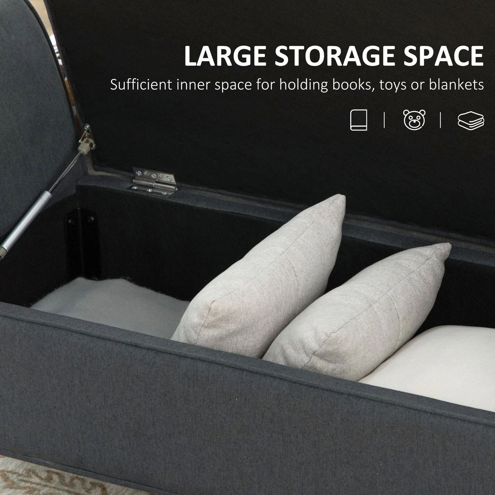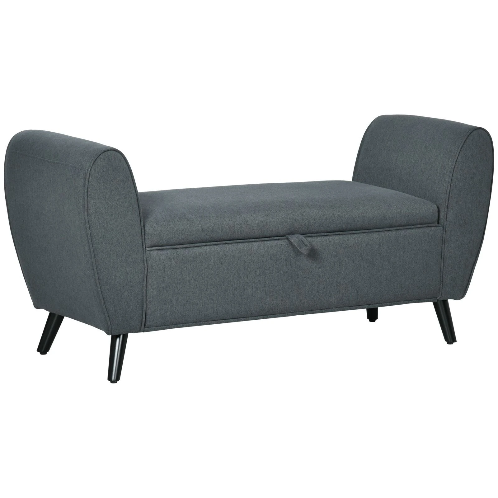 Modern Upholstered Storage Bench with Arms, Linen-Feel Fabric Ottoman Bench for Bedroom, Entryway, and Living Room, Dark Grey
