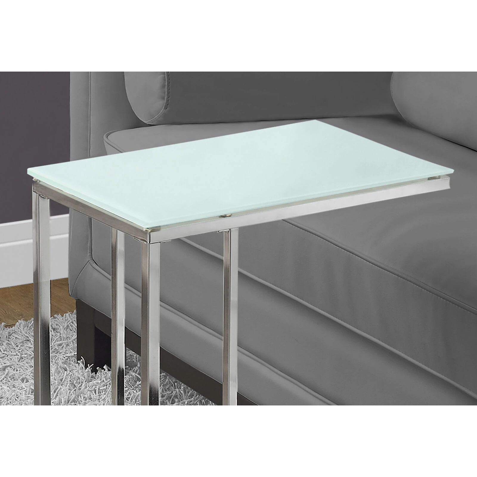 A perfectly tapered contemporary rectangular accent table that fits independently with any furniture in your home; features a chic white frosted 5mm thick tempered glass surface perfect for your tablet, snacks, drinks or even meals. The stylish chrome metal base provides sturdy support along with a fashionable touch. This practical and functional snack table is a must-have for your home or office.