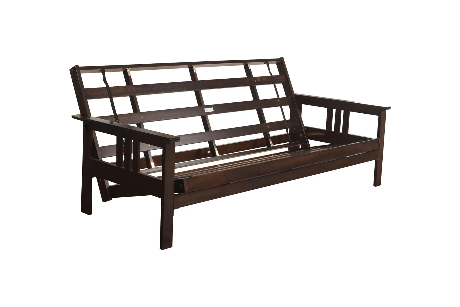 The mission style design on the arms of this solid wood futon frame cradle your mattress for sleeping comfort — pillows and sheets stay put when using it as a bed. This easy-to-adjust frame comes in an array of colors and the comfort of sofa height seating, making this futon ideal for your bedroom, living room, or family room .