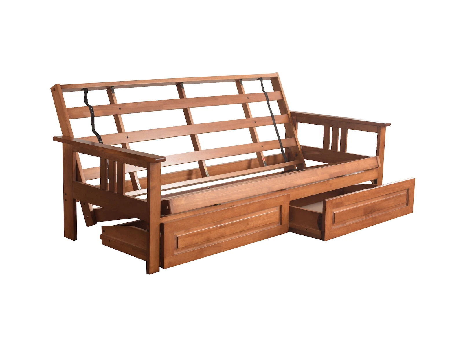 The mission style design on the arms of this solid wood futon frame cradle your mattress for sleeping comfort — pillows and sheets stay put when using it as a bed. This easy-to-adjust frame comes in an array of colors and the comfort of sofa height seating, making this futon ideal for your bedroom, living room, or family room . This futon frame has two optional drawers for out-of-sight storage.