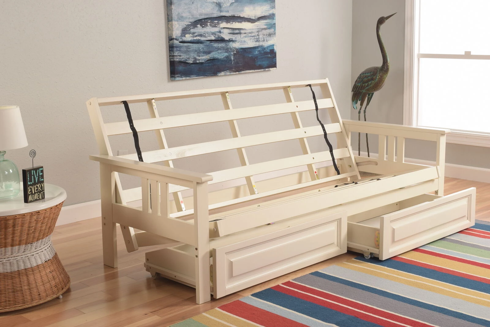 Monterey Futon with Storage Drawers in Antique White Finish with Marmont Thunder Mattress