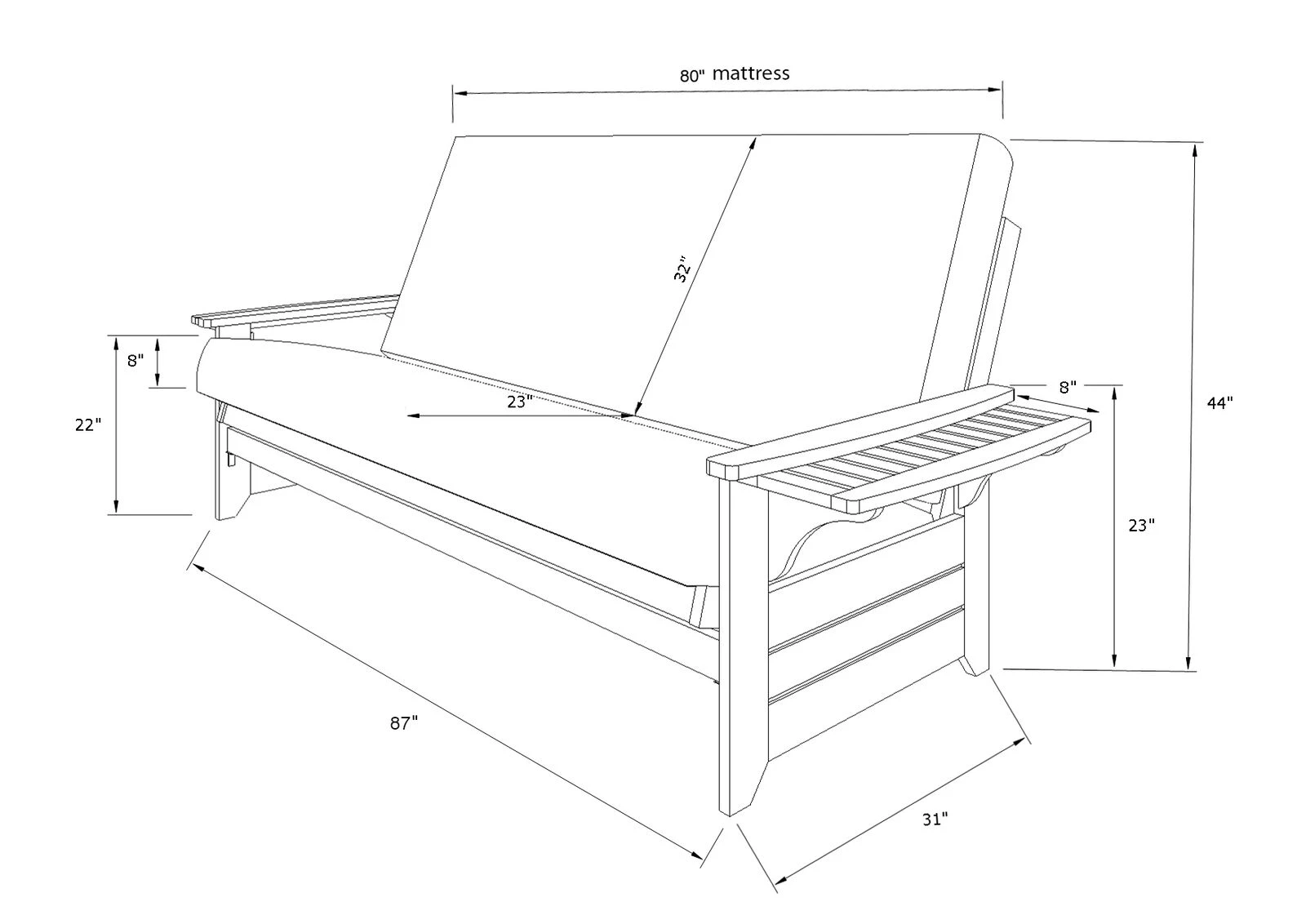 Exceptional function and artistry are featured in this solid wood futon frame with optional drawers. This piece is an excellent choice for a family room or game room. The convenient fold out arm trays of this piece will securely hold your snacks and drinks whether playing games or watching a movie. The clean, slat design and multiple color choice make this futon frame ideal for your home décor. The mattress has hinged coil innersprings, covered with high density foam, and finished with decorative, tufted upholstery for softness and moldability allowing the mattress to rest in the perfect position every time.