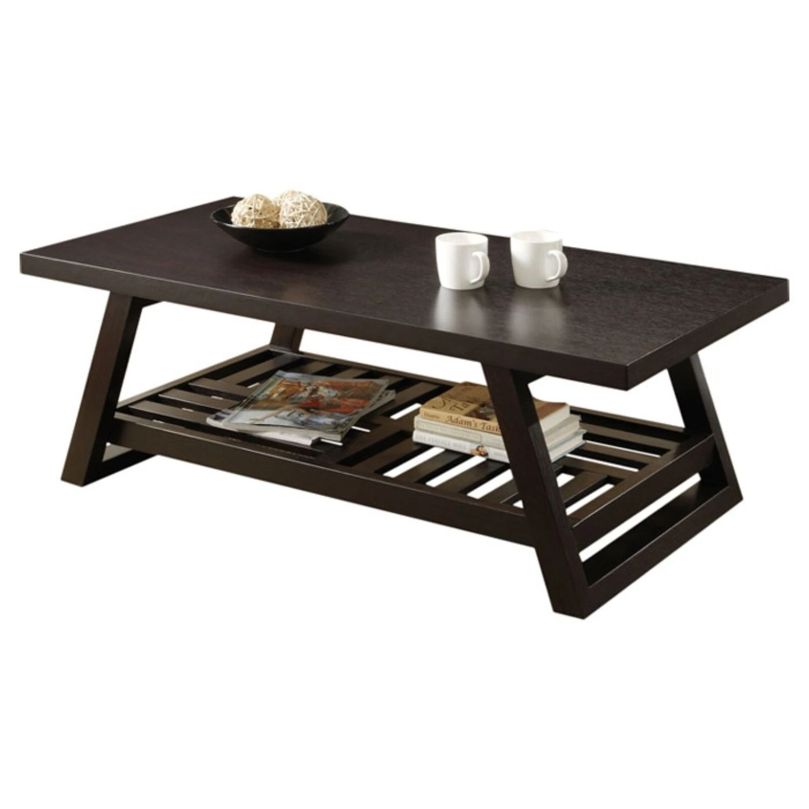 - Contemporary Coffee Table with Slatted Bottom Shelf in Rich Brown