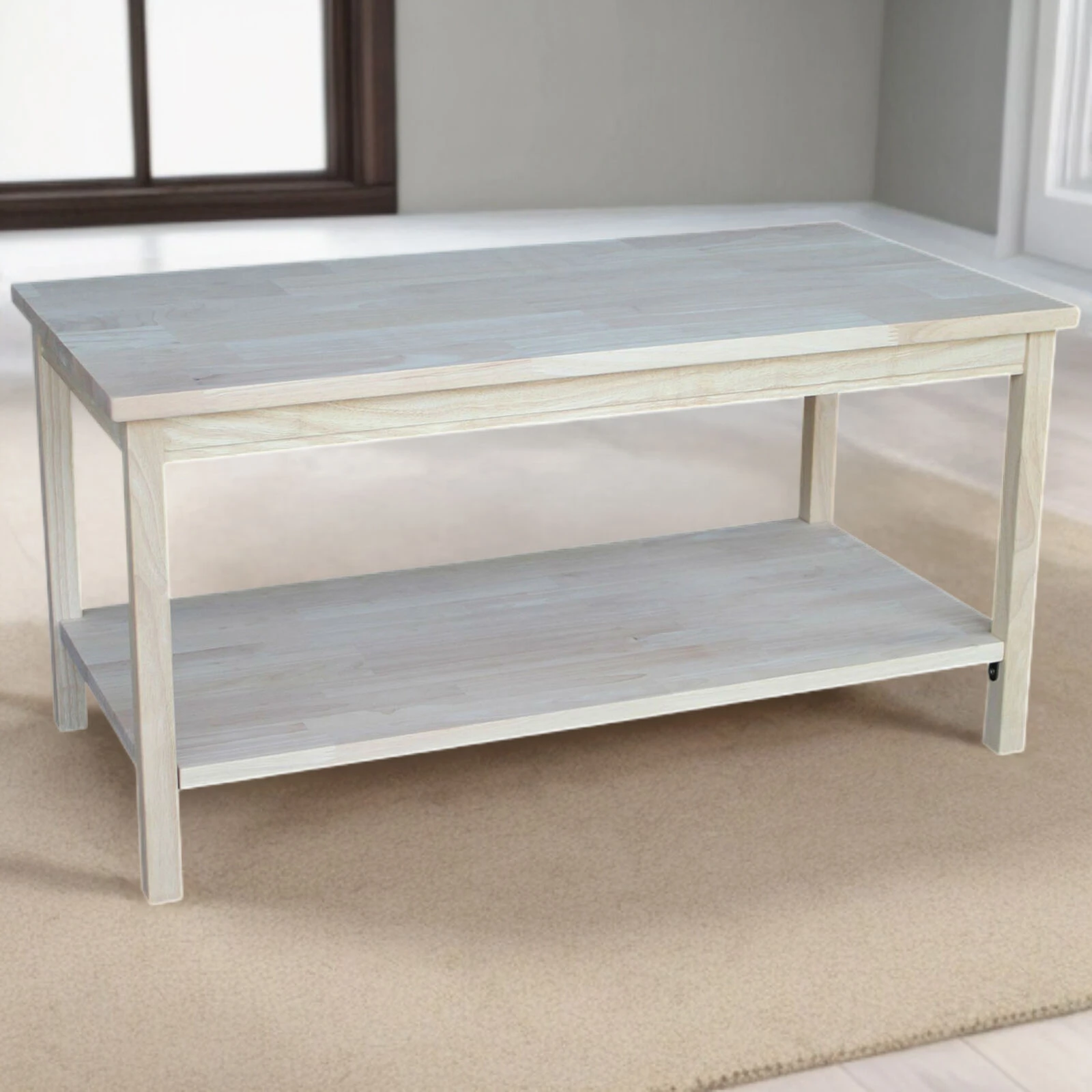 - Unfinished Solid Wood Rectangular Coffee Table with Bottom Shelf