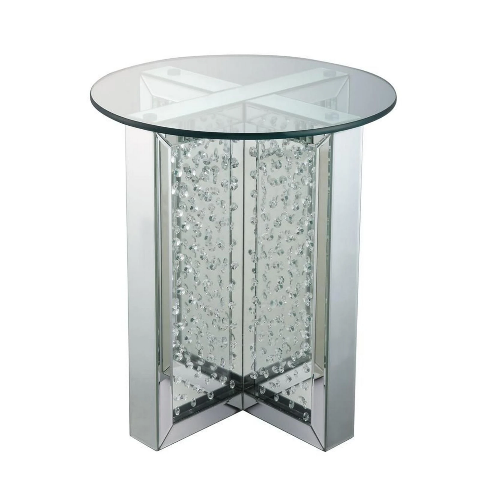 This End Table will bring glamour and lux design to your living room or family room. Featuring a tempered glass top that rests on a fully mirrored ?X? shaped base with round faux crystal inserts, this end table will instantly catch eyes of your guests. The ?X? shaped base combines sturdy support with style making this versatile end table a welcome addition to your home. Place this end table among your favorite seating group to add that shimmering finishing touch and turn any ordinary room into a luxurious retreat. Note: Other featured items in image except this end table are sold separately.