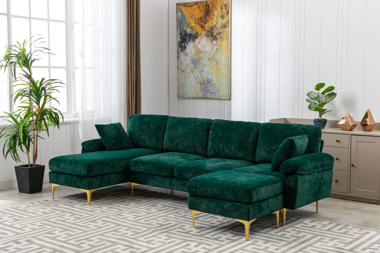 This U-shape sectional sofa is a spacious and durable addition to your living space. It features a sturdy solid wood frame and chenille fabric filled with high-density sponge, ensuring both beauty and comfort. The modular design allows for easy customization, with each seat being removable. The cushion cover is made of soft and durable fabric that is machine washable, making it easy to keep clean and hygienic. The sofa also comes with solid black legs that provide excellent support and durability. With its U-shaped design and included ottomans, this sectional sofa is perfect for lounging and relaxing. Assembly is required, but the package includes instructions and a tool for easy setup.