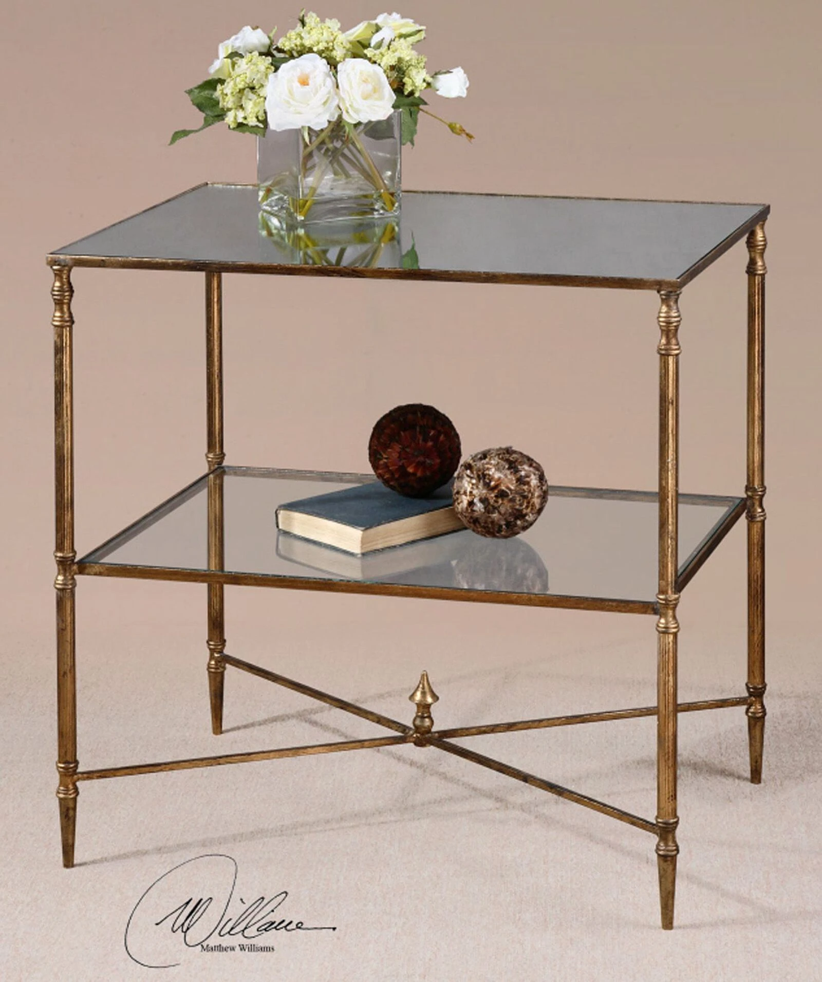 An Elegant Silhouette In Iron With A Cross Stretcher Accent Finished In Gold Leaf With Heavy Antiquing. Top Is Reinforced Mirror And Gallery Shelf Is Clear Tempered Glass.
