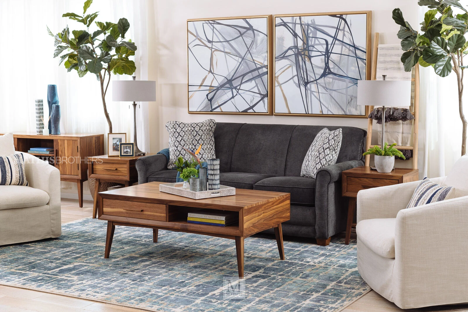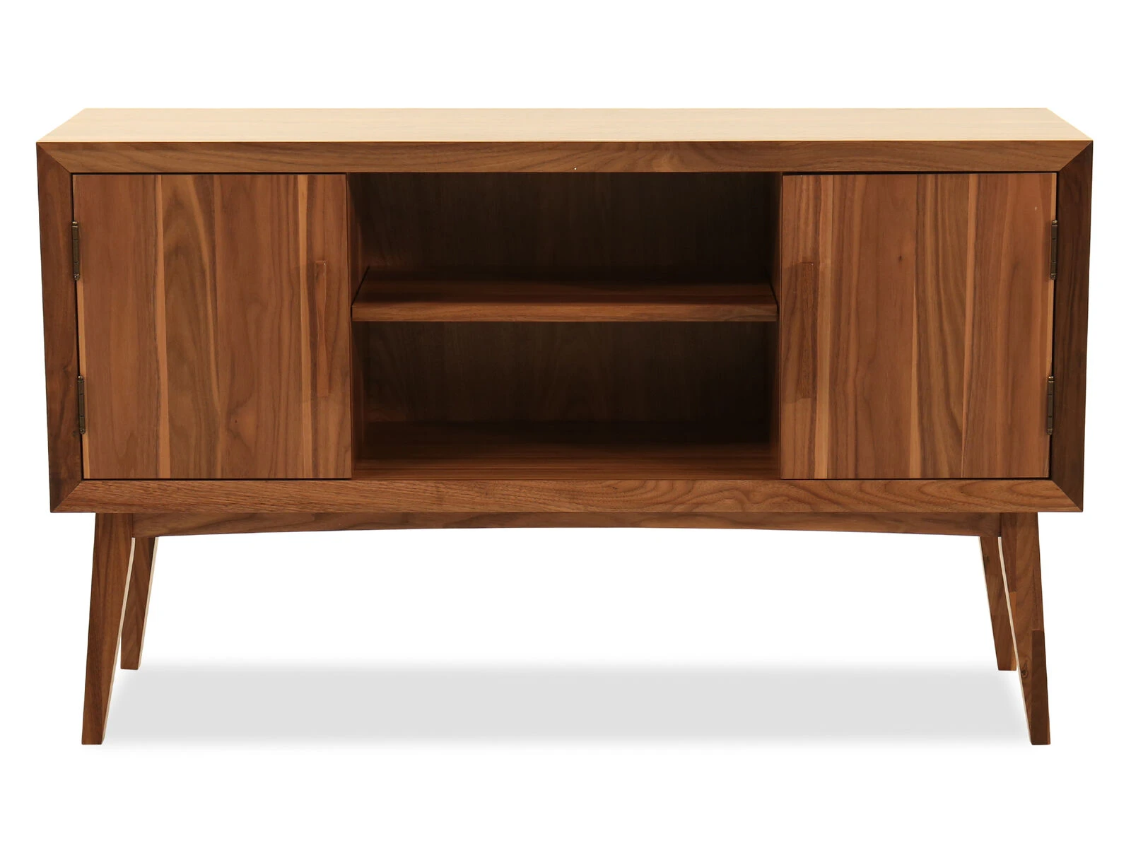 You will instantly fall in love at the sight of the Venice Sofa Table in Walnut. Crafted from durable walnut solids and veneers with engineered wood, it features multiple storage options including a two-door stashing space on both sides and a spacious open compartment in the middle. Flaunting a rectangular silhouette, this living room furniture is washed in honey tones to bring a natural look.